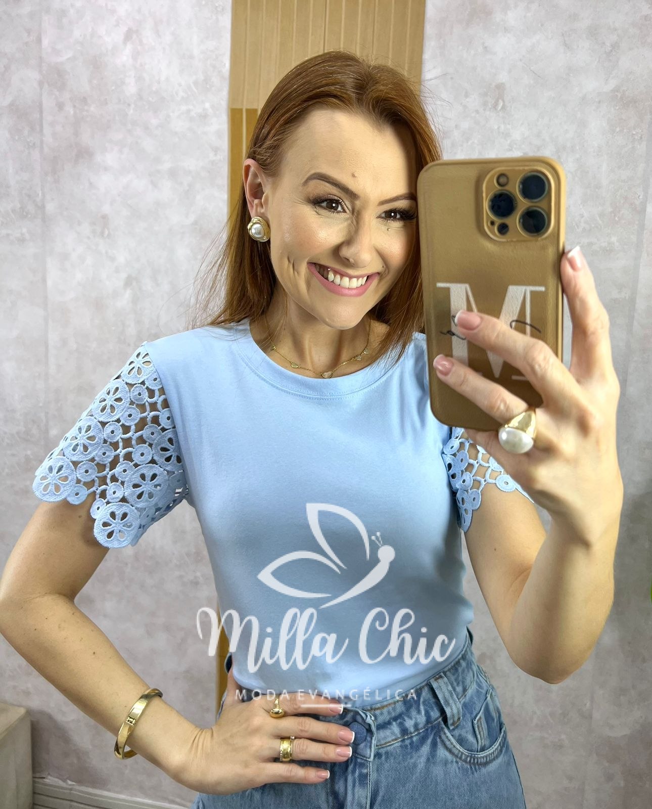 Aquela blusa confortável e estilosa para looks casuais ficarem mais elegantes e sofisticados. Confeccionada em malha 100% algodão. Muito confortável e fresca. E o detalhe que faz toda diferença e deixa ela linda, delicada e muito chic é a manga toda em guipper . É o que traz toda a elegância para essa blusa.