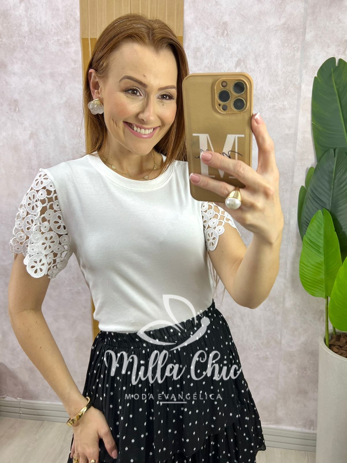 Aquela blusa confortável e estilosa para looks casuais ficarem mais elegantes e sofisticados. Confeccionada em malha 100% algodão. Muito confortável e fresca. E o detalhe que faz toda diferença e deixa ela linda, delicada e muito chic é a manga toda em guipper . É o que traz toda a elegância para essa blusa.