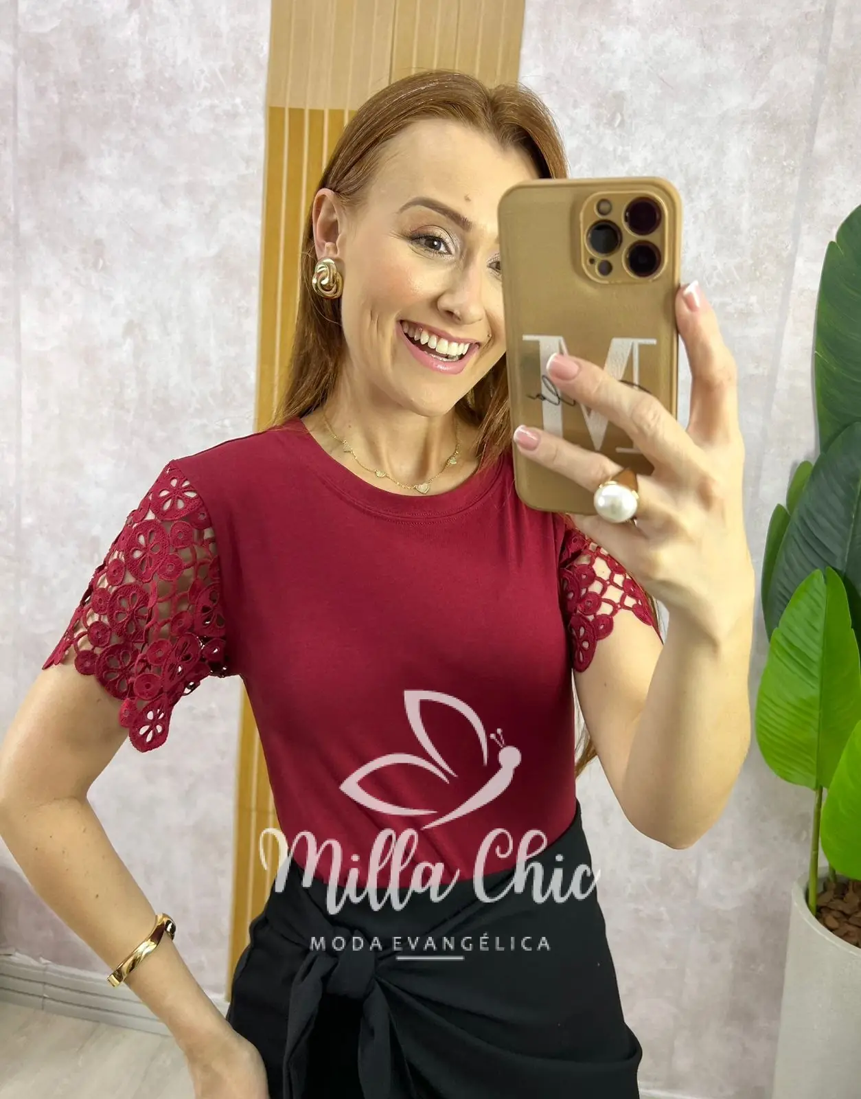 Aquela blusa confortável e estilosa para looks casuais ficarem mais elegantes e sofisticados. Confeccionada em malha 100% algodão. Muito confortável e fresca. E o detalhe que faz toda diferença e deixa ela linda, delicada e muito chic é a manga toda em guipper . É o que traz toda a elegância para essa blusa.