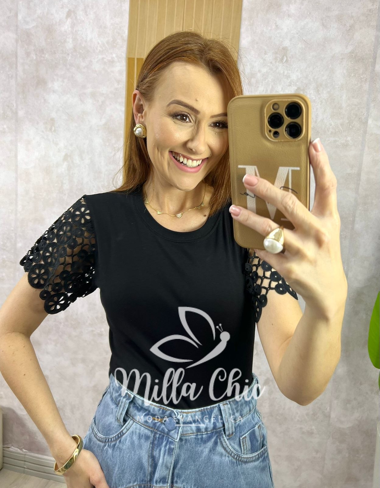 Aquela blusa confortável e estilosa para looks casuais ficarem mais elegantes e sofisticados. Confeccionada em malha 100% algodão. Muito confortável e fresca. E o detalhe que faz toda diferença e deixa ela linda, delicada e muito chic é a manga toda em guipper . É o que traz toda a elegância para essa blusa.