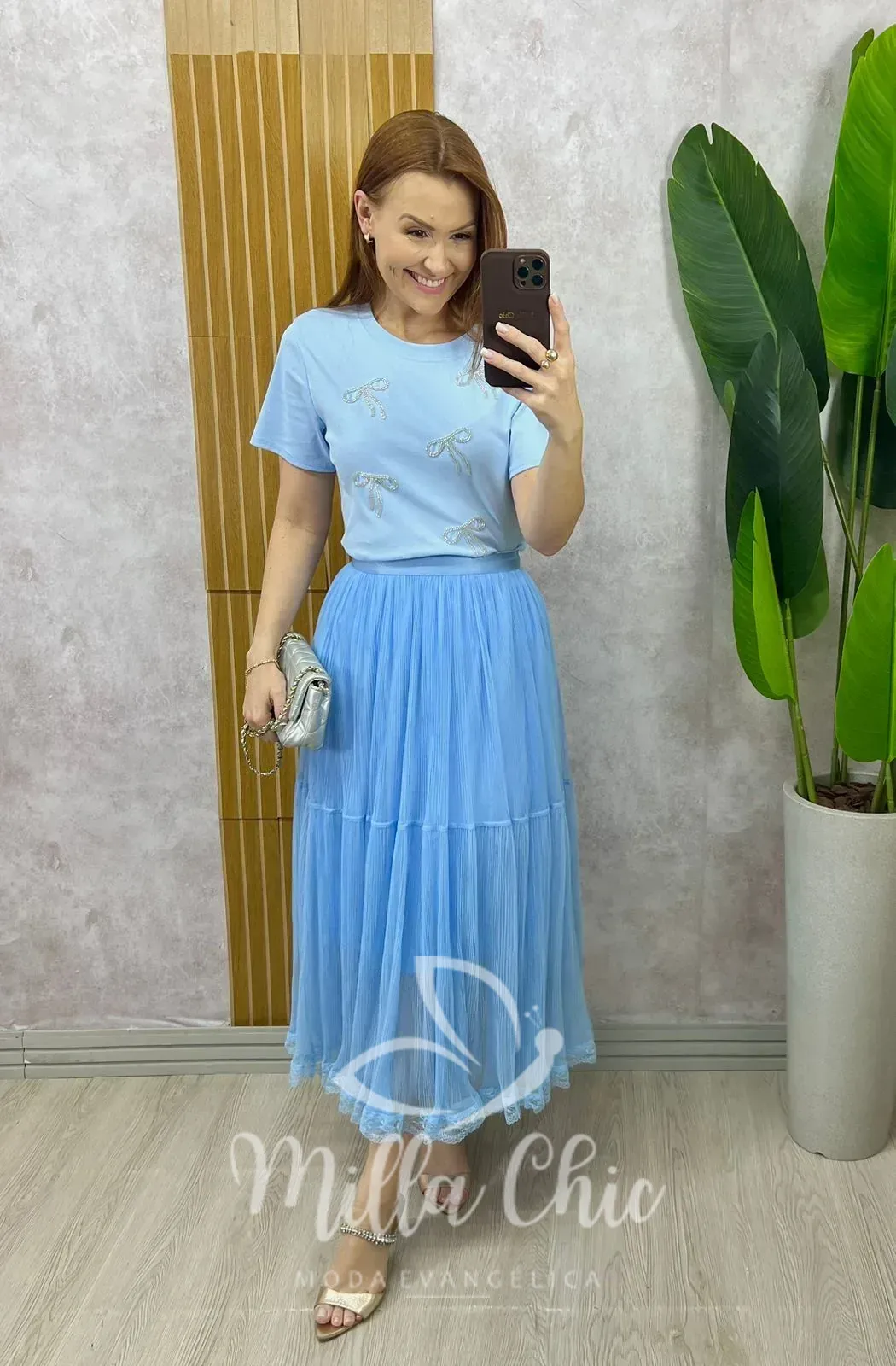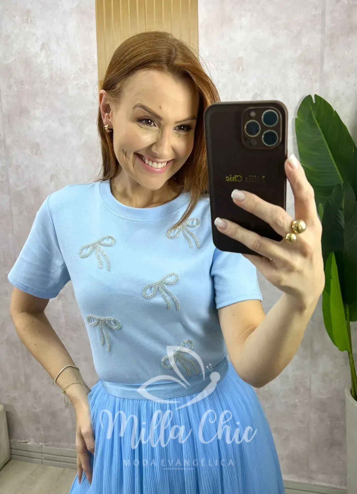 Aquela blusa confortável e estilosa para looks casuais ficarem mais elegantes e sofisticados. Confeccionada em malha 100% algodão. Muito confortável e fresca. E o detalhe que faz toda diferença e deixa ela linda, delicada e muito chic são os laços bordados a mão todo em canutilhos. É o que traz toda a elegância para essa blusa.