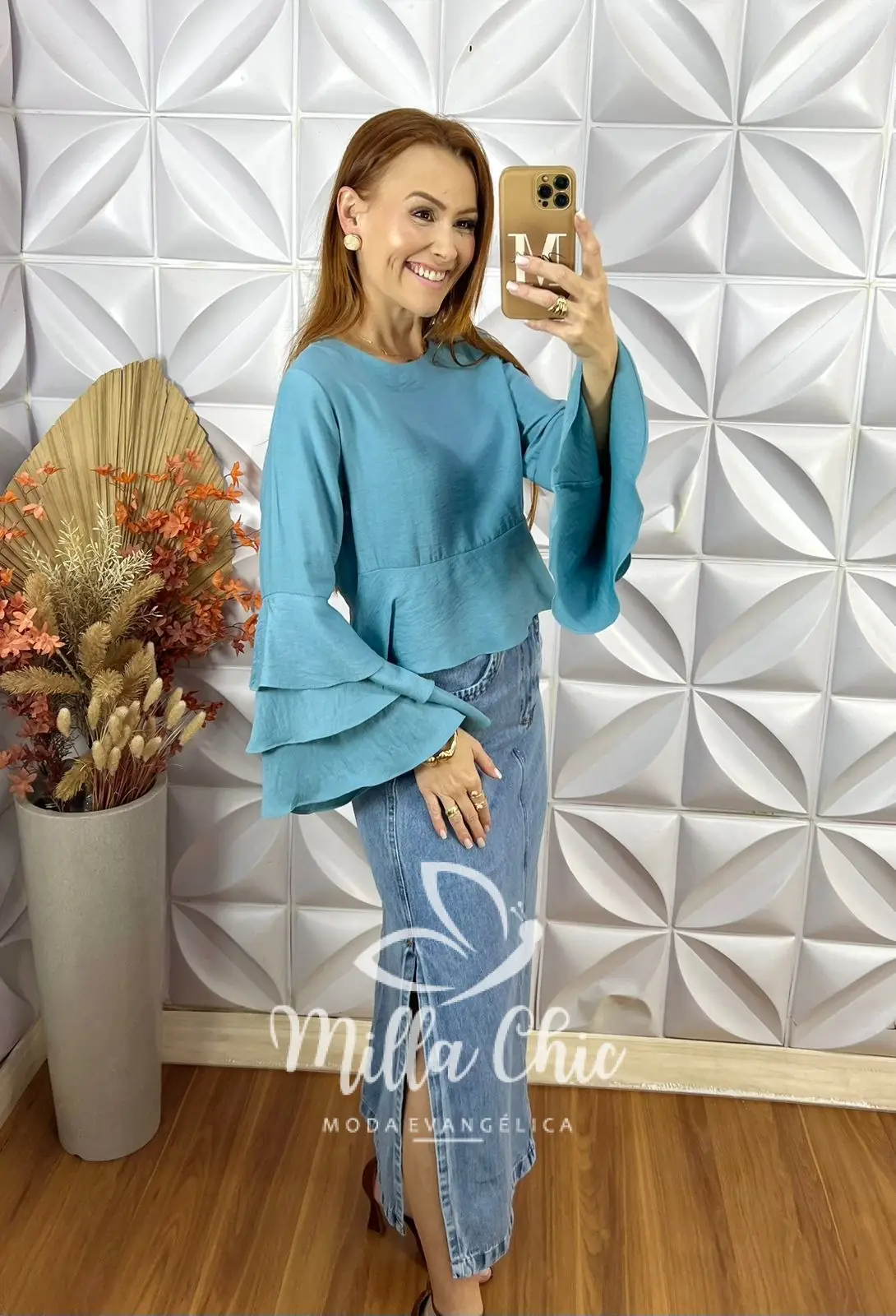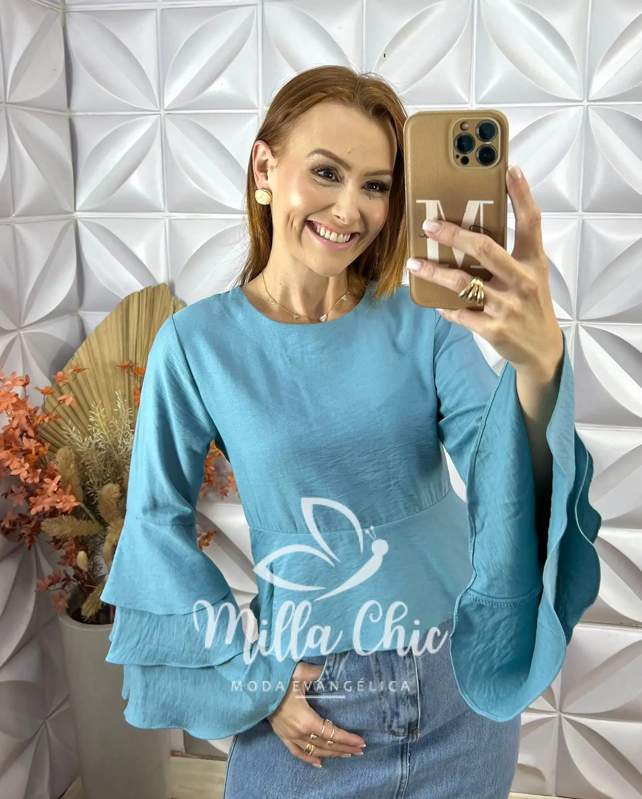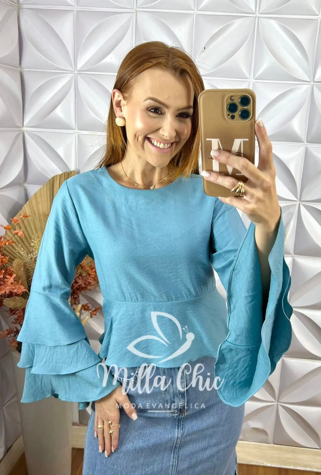 Ela possui a manga com três babados e um babado no final da blusa trazendo muita sofisticação para esse modelo .