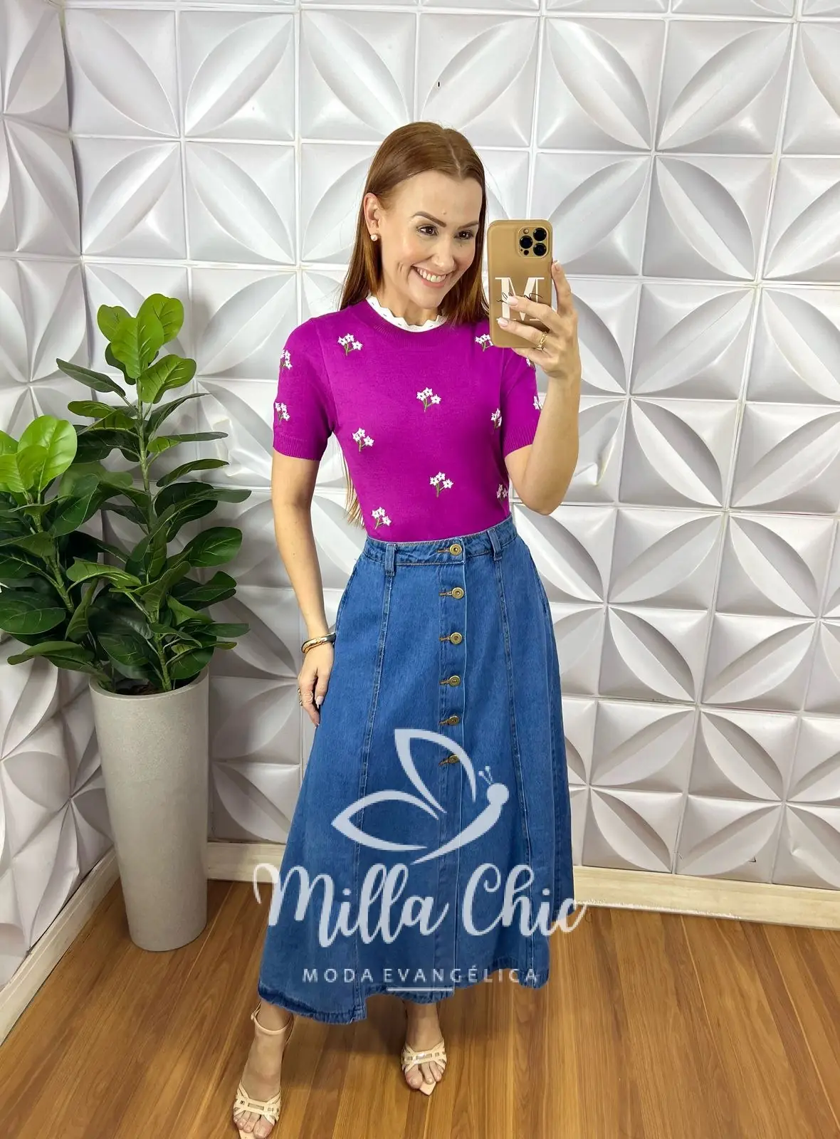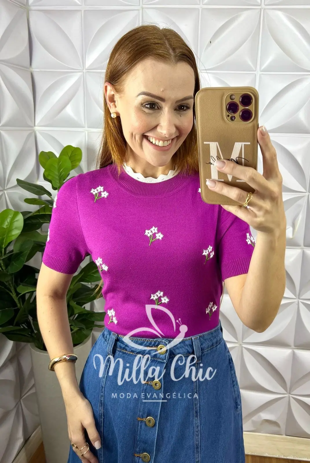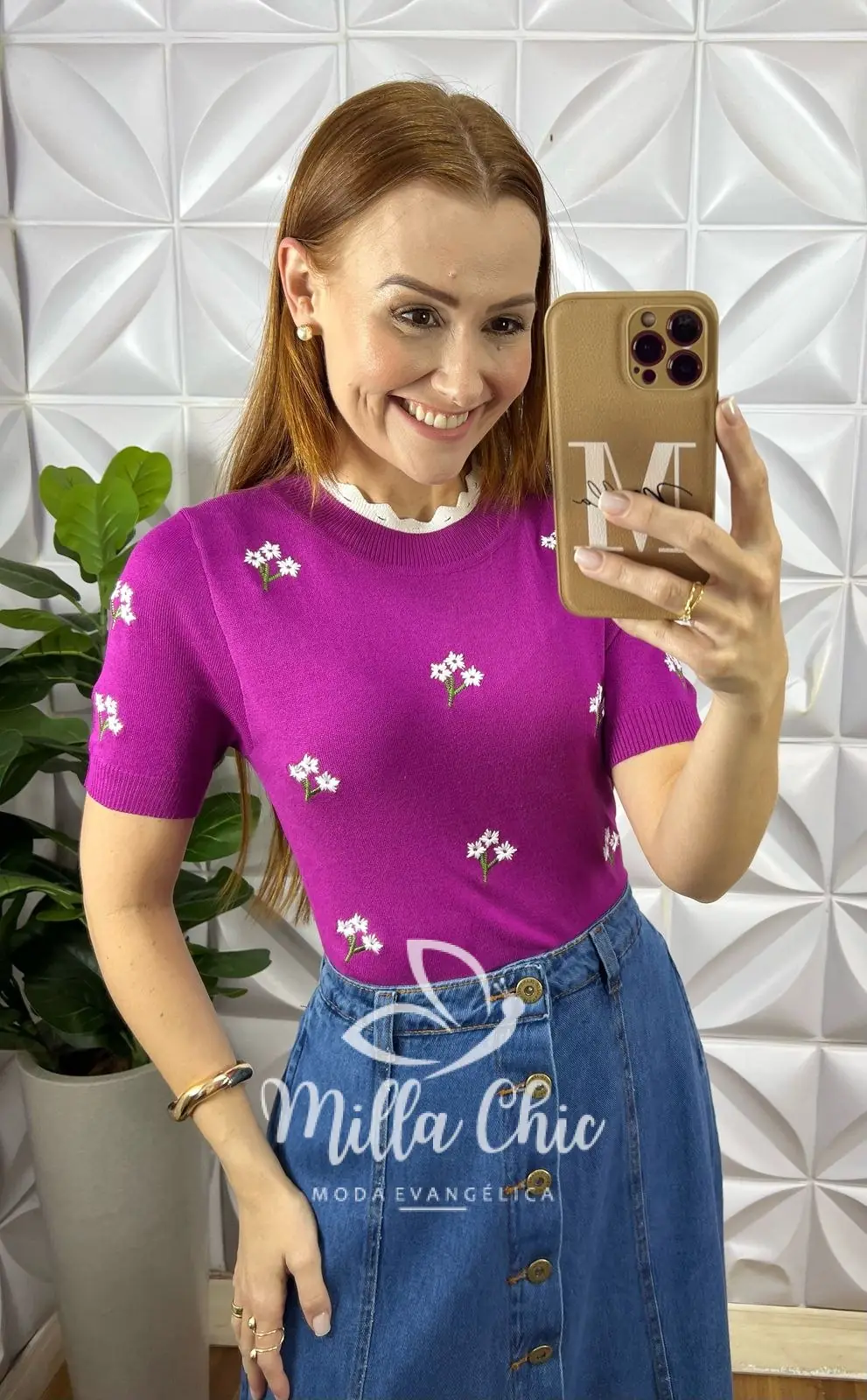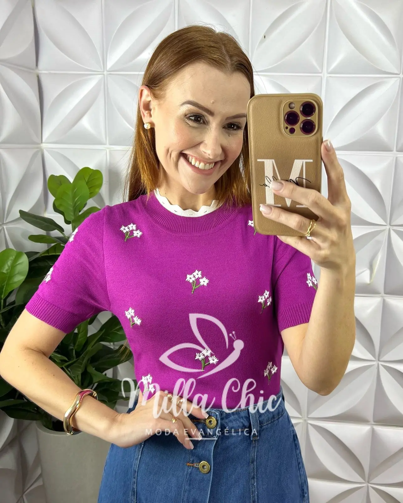 Possui: Manga justa, Gola redonda marcada com trabalhado envolta, com bordado de flor, comprimento ideal.
