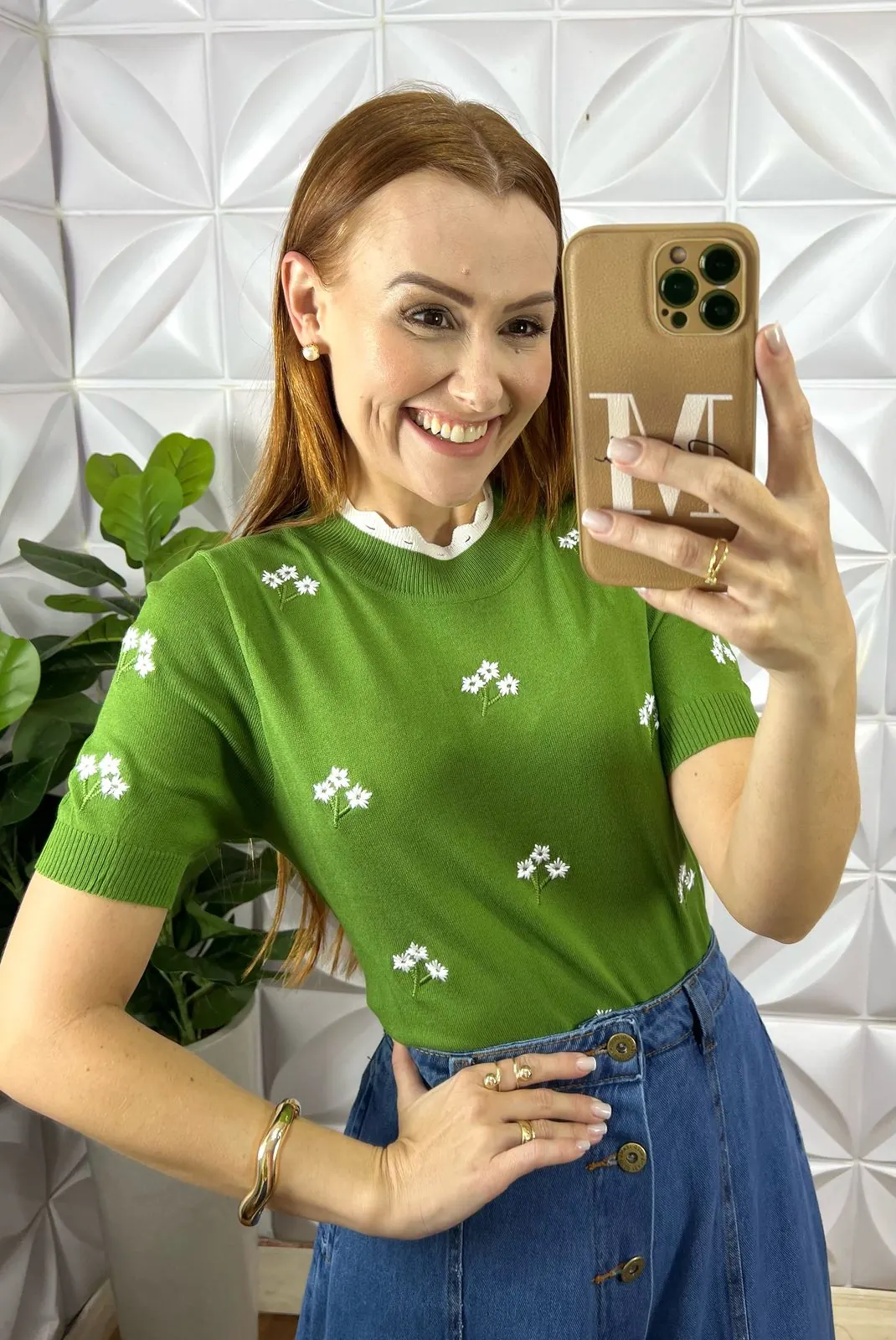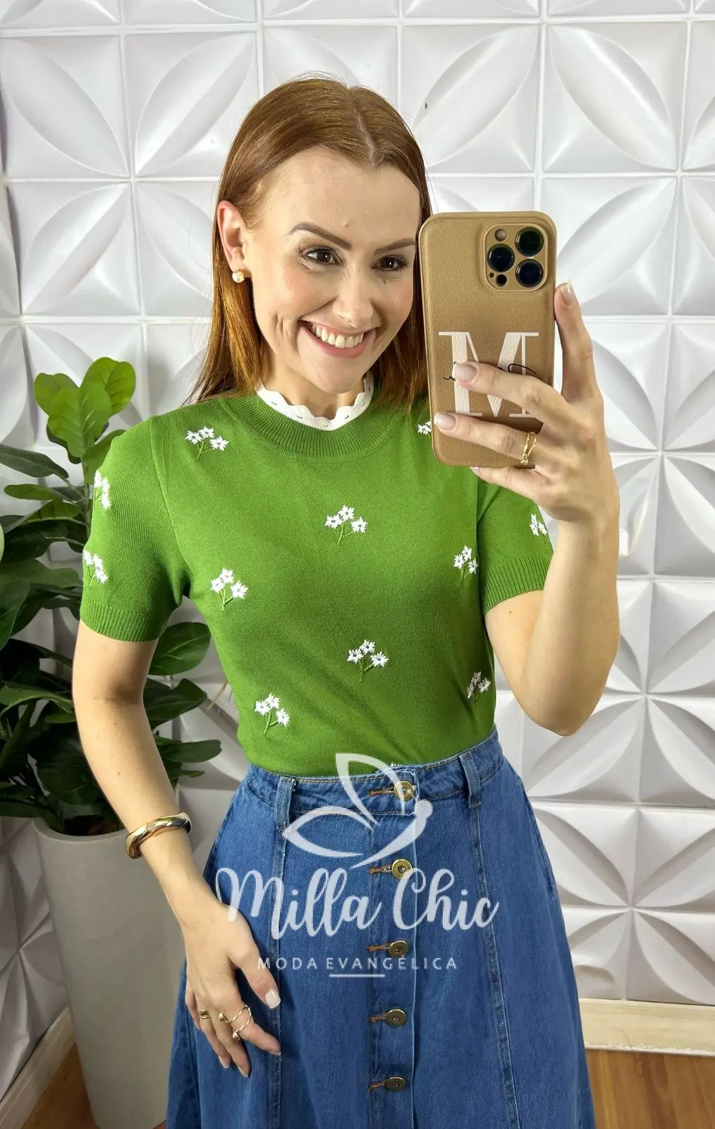 Possui: Manga justa, Gola redonda marcada com trabalhado envolta, com bordado de flor, comprimento ideal.