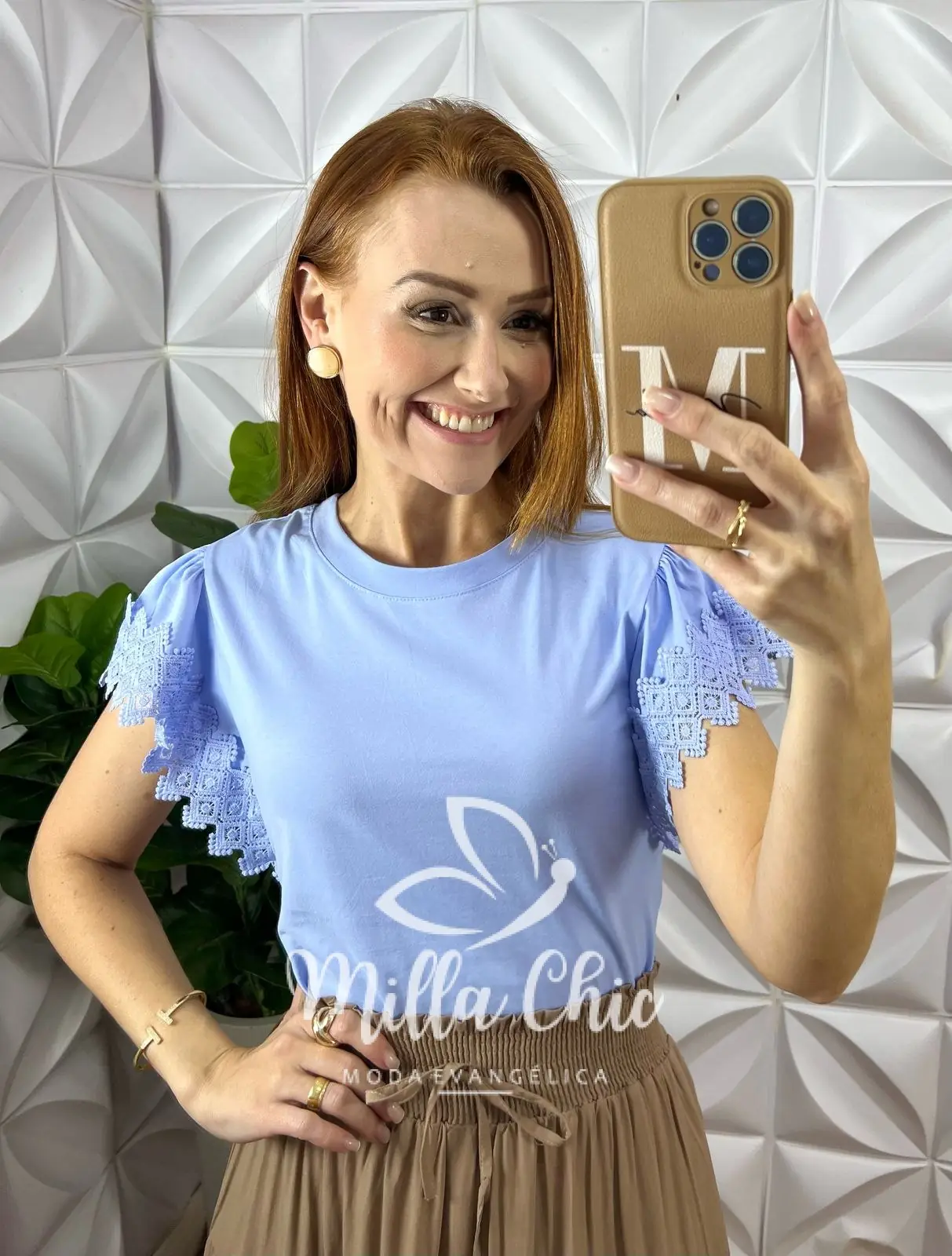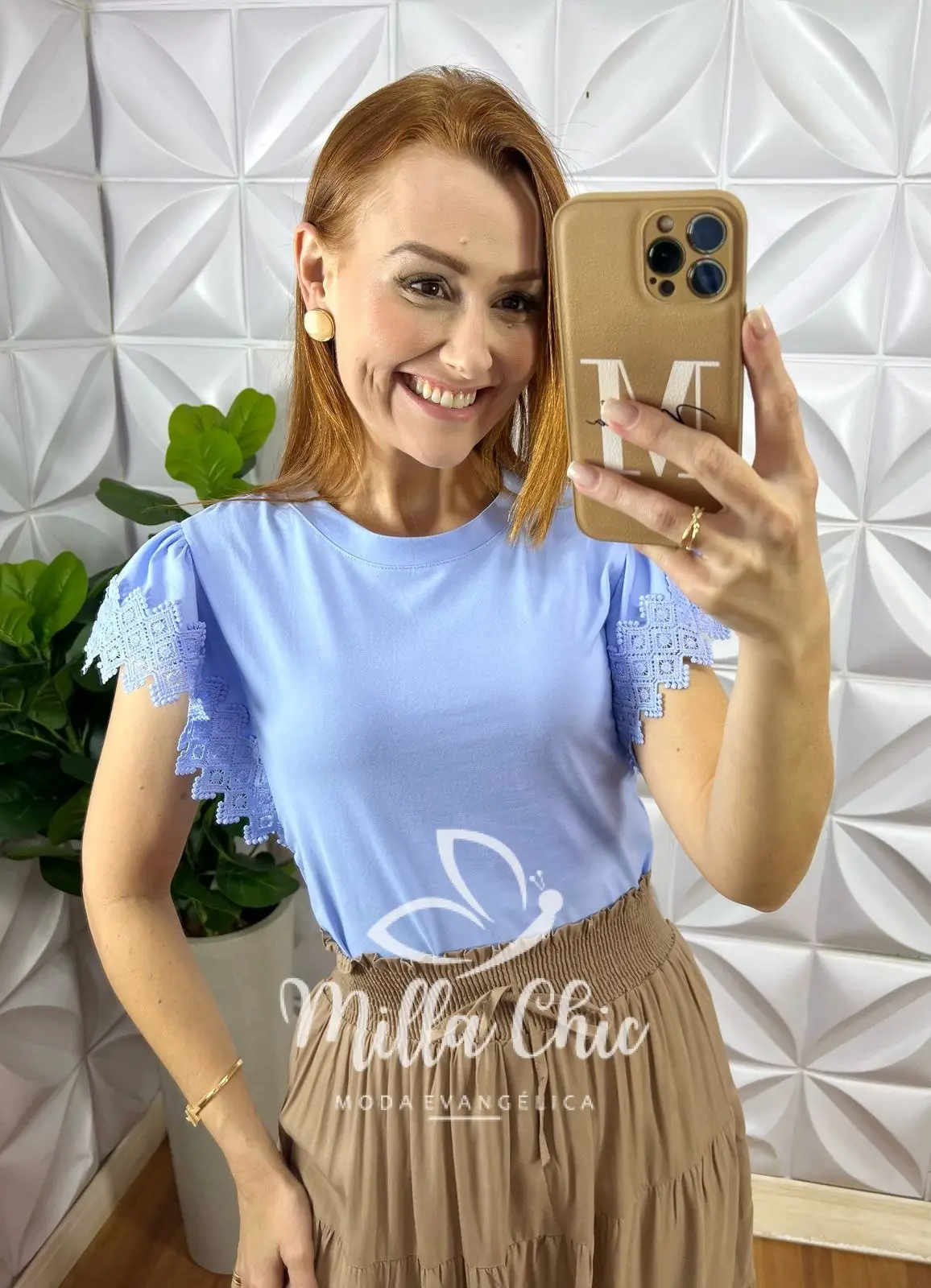 O detalhe que deixa ela maravilhosa é a aplicação na manga em renda guipper . O que deixa ela mais lindona a delicada.