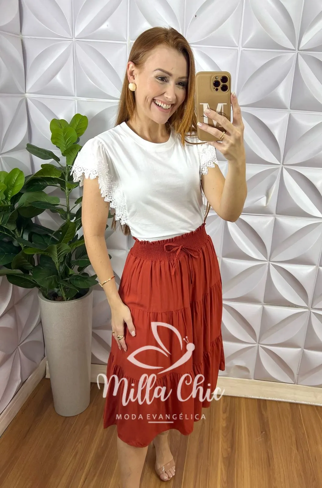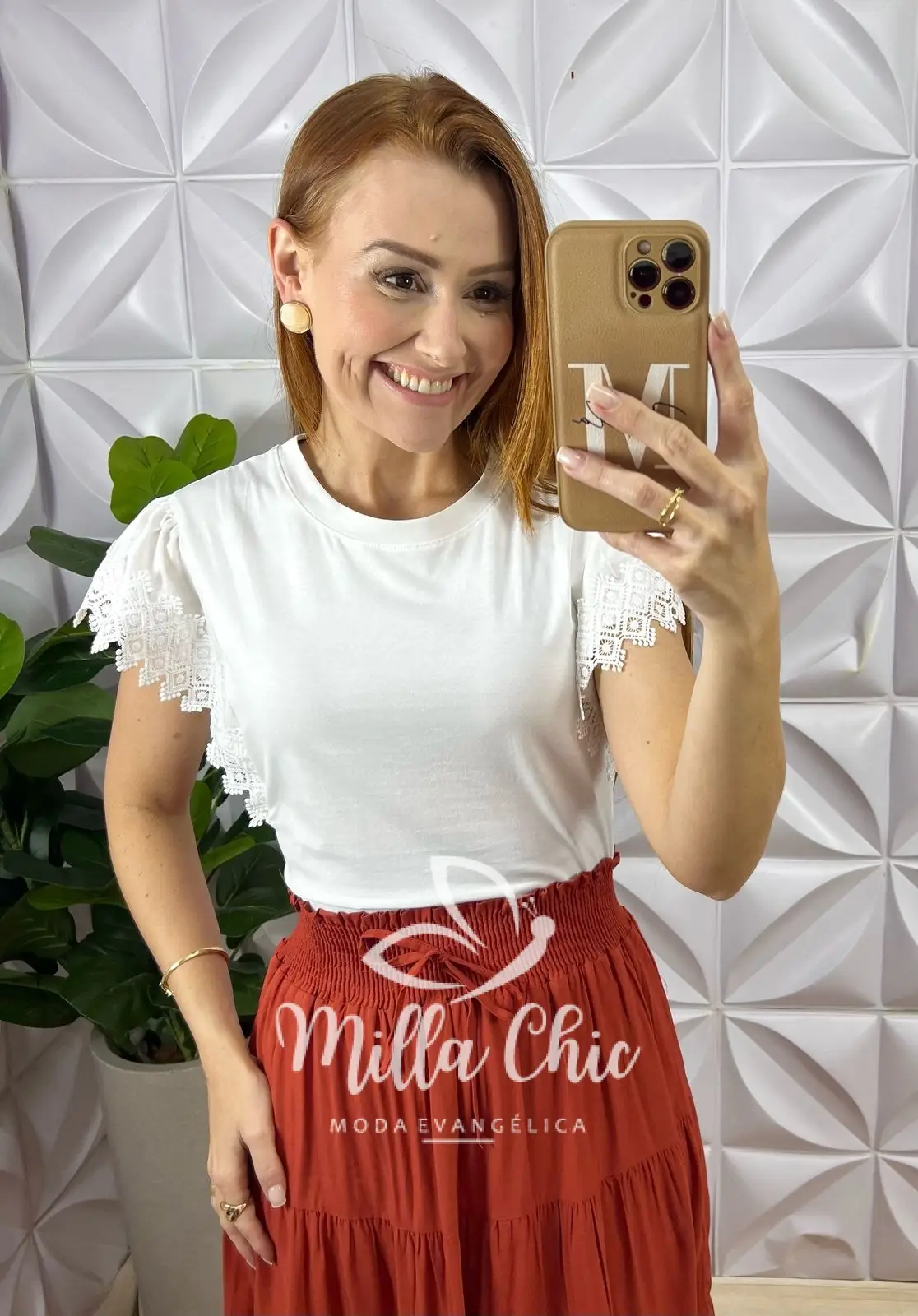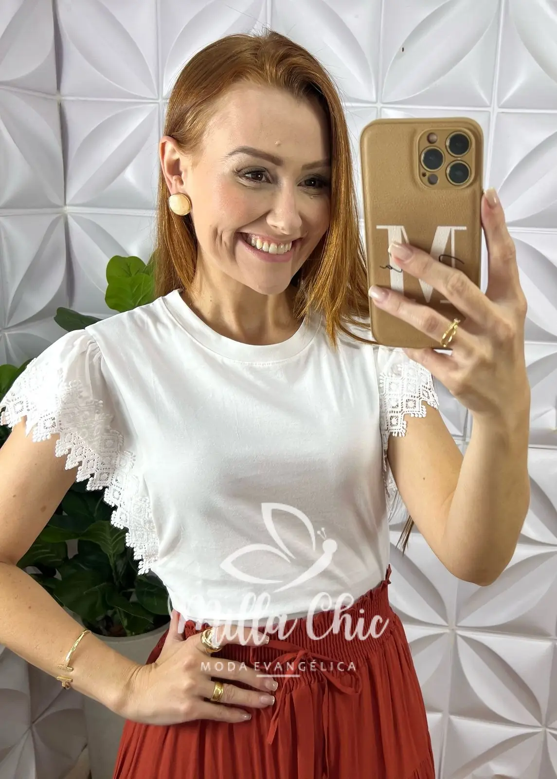O detalhe que deixa ela maravilhosa é a aplicação na manga em renda guipper . O que deixa ela mais lindona a delicada.