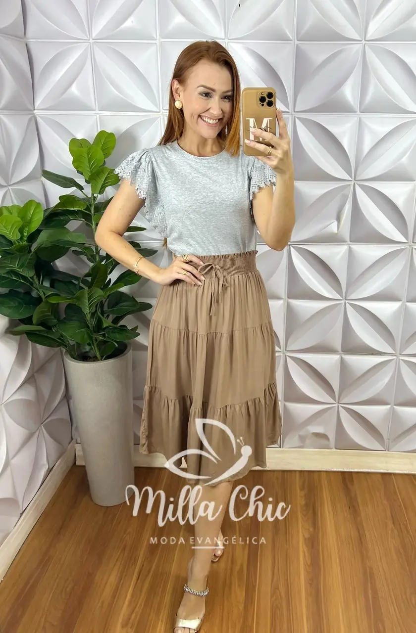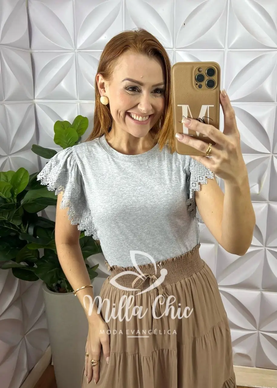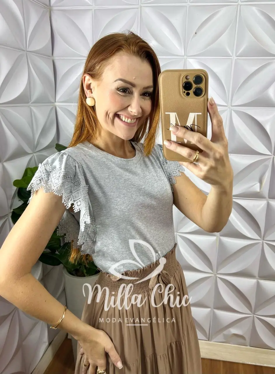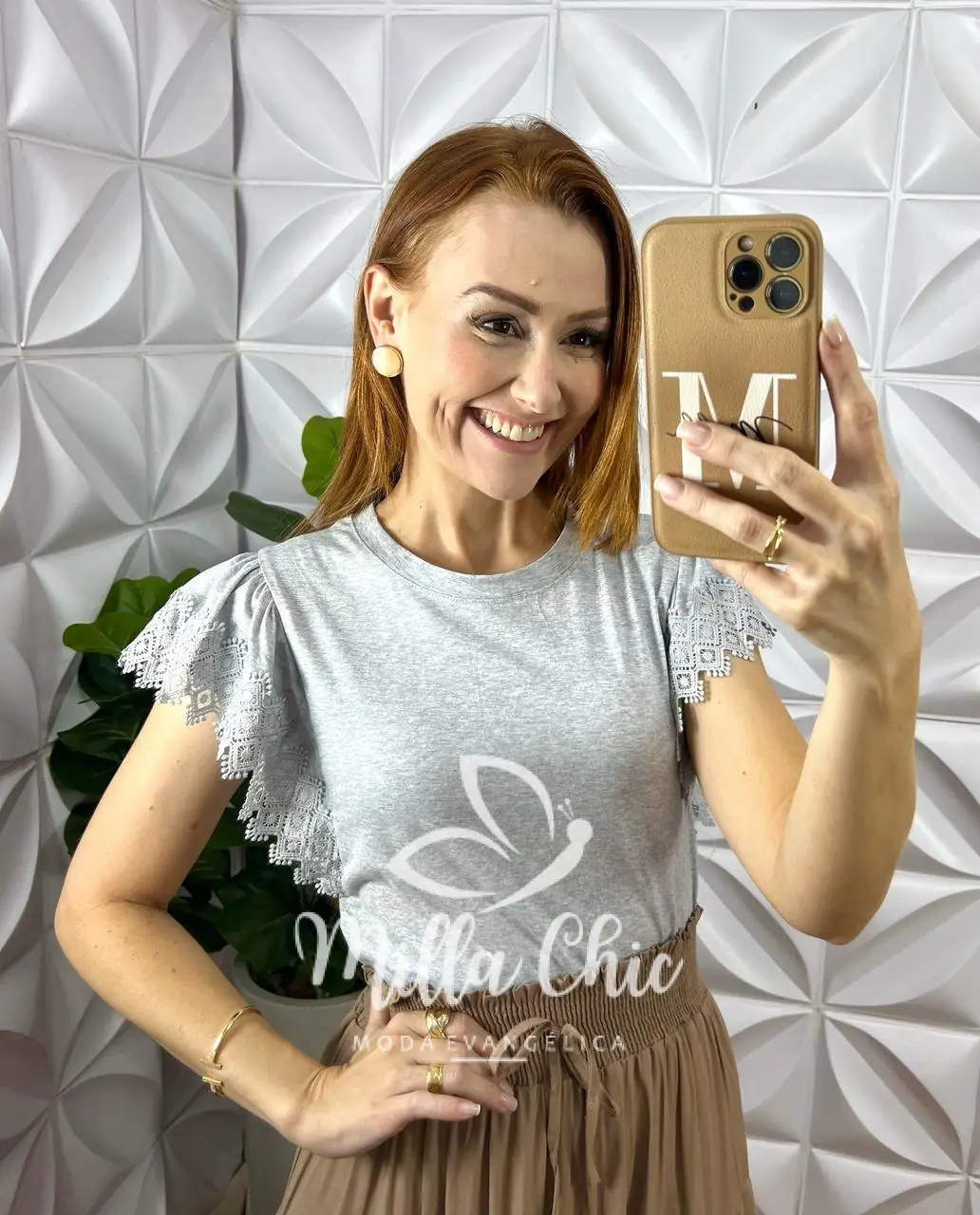 Blusa Athenas Em Malha Com Manga Guipper - Cinza - Milla Chic