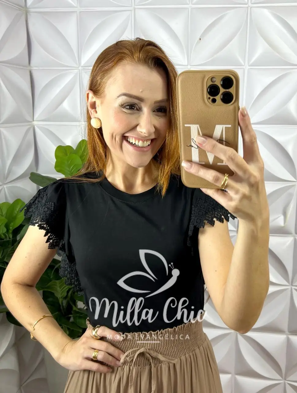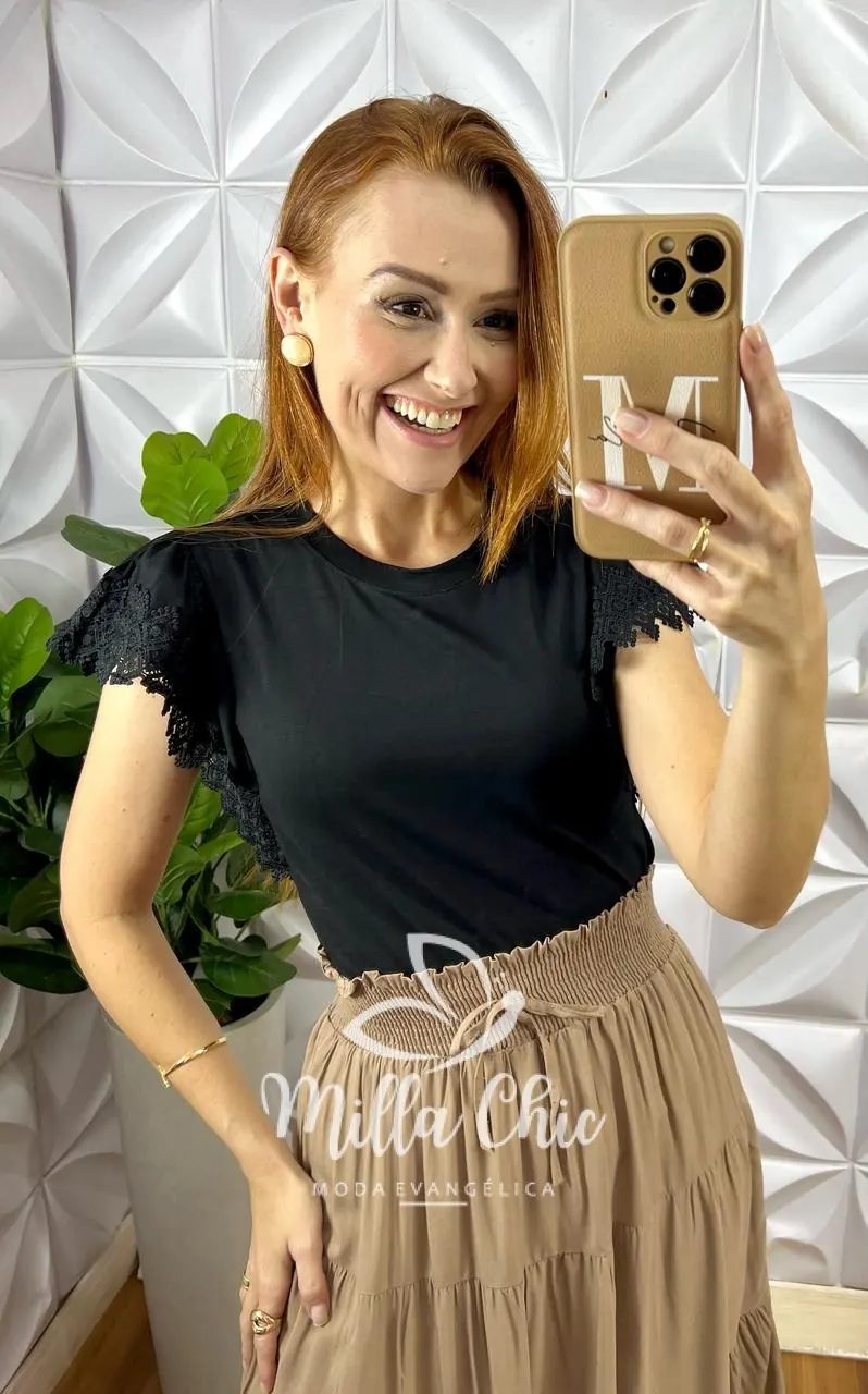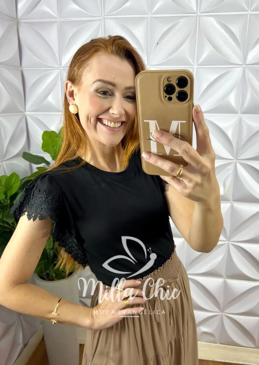 O detalhe que deixa ela maravilhosa é a aplicação na manga em renda guipper . O que deixa ela mais lindona a delicada.