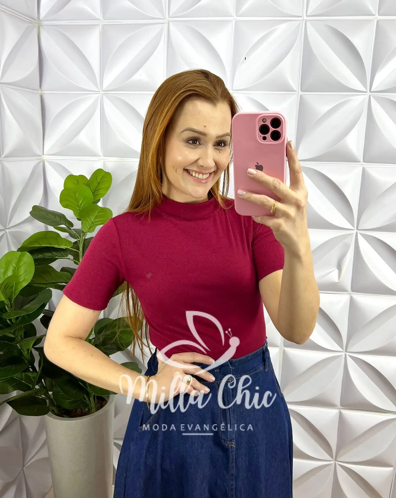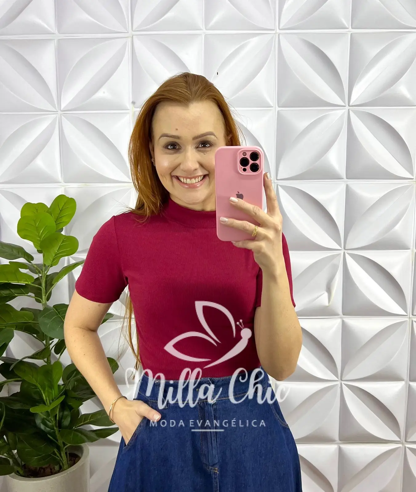 Blusa Canelada de Algodão Gola Alta Paloma - Cherry - Milla Chic