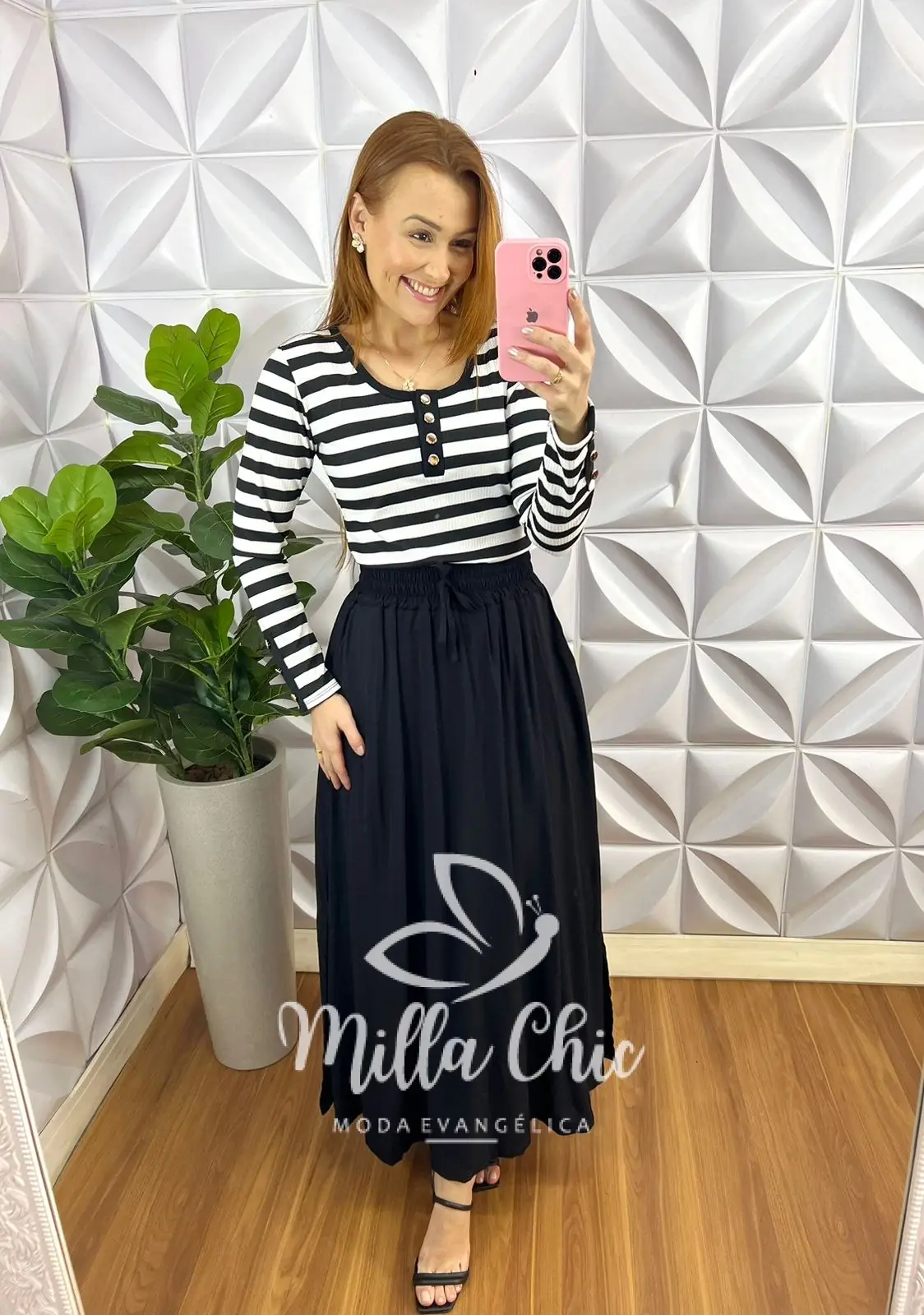 Saia Viscolinho Longa com Lastex na Cintura Adriana - Preto - Milla Chic
