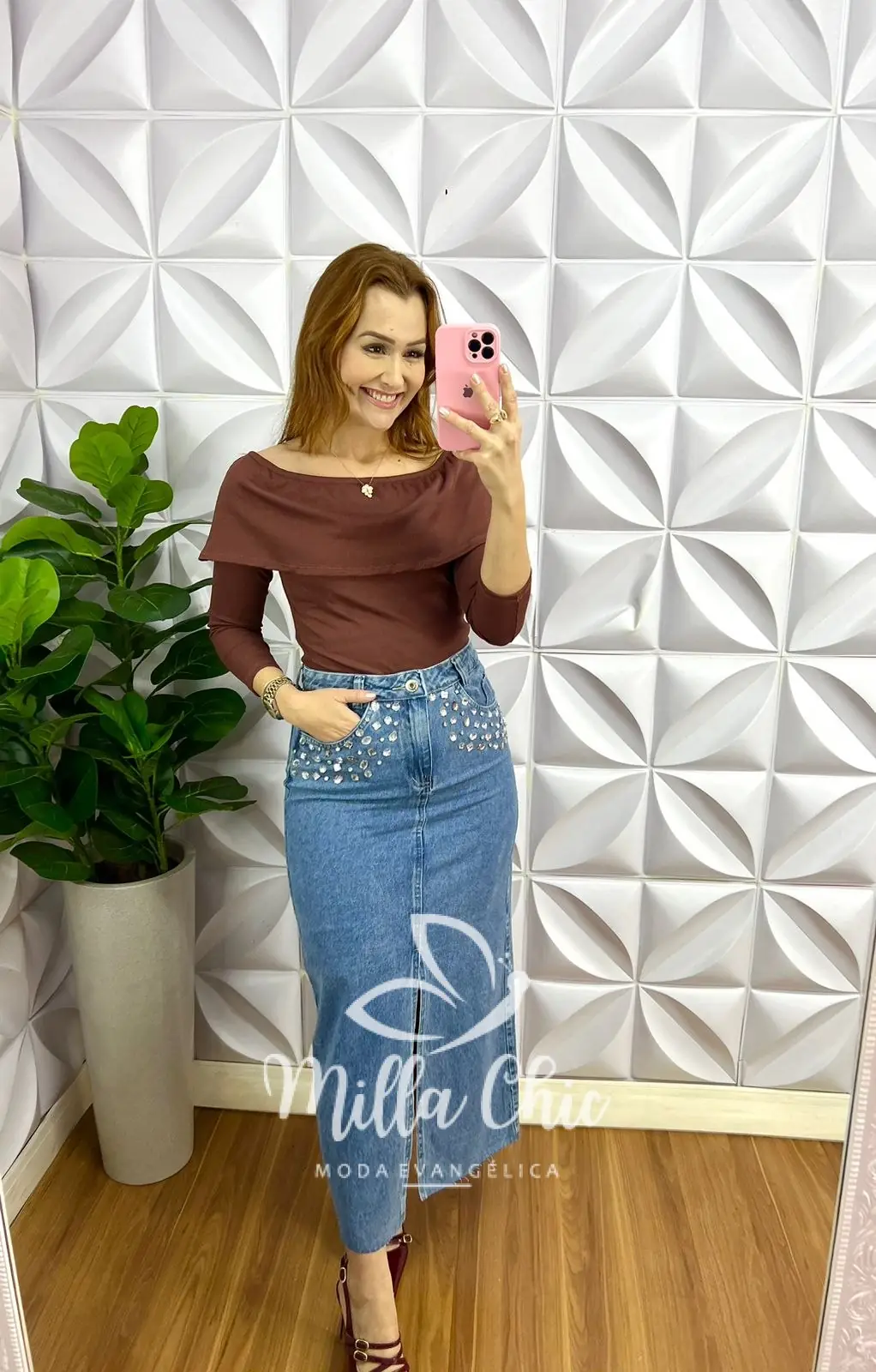 Blusa Canelado Ribana Manga Longa Com Pala No Decote Ágata – Marrom
