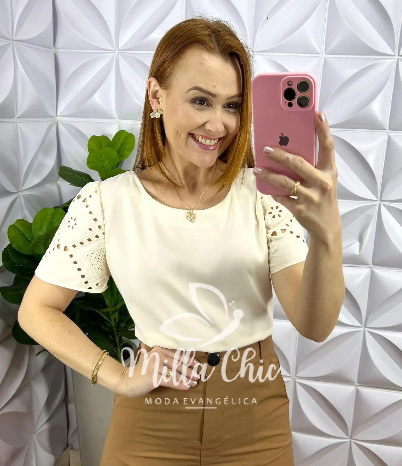 Blusa Cetim Manga Com Bordado Richelieu Sandra - Areia - Milla Chic