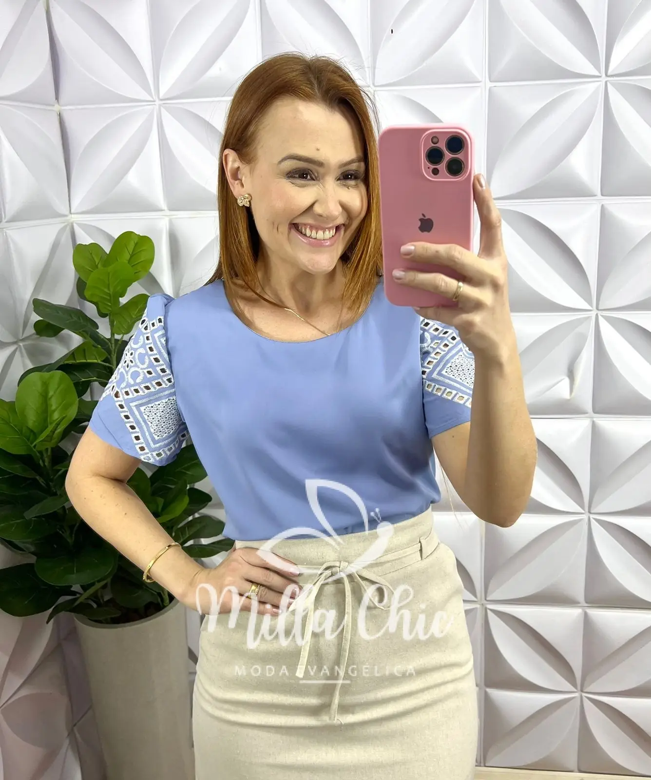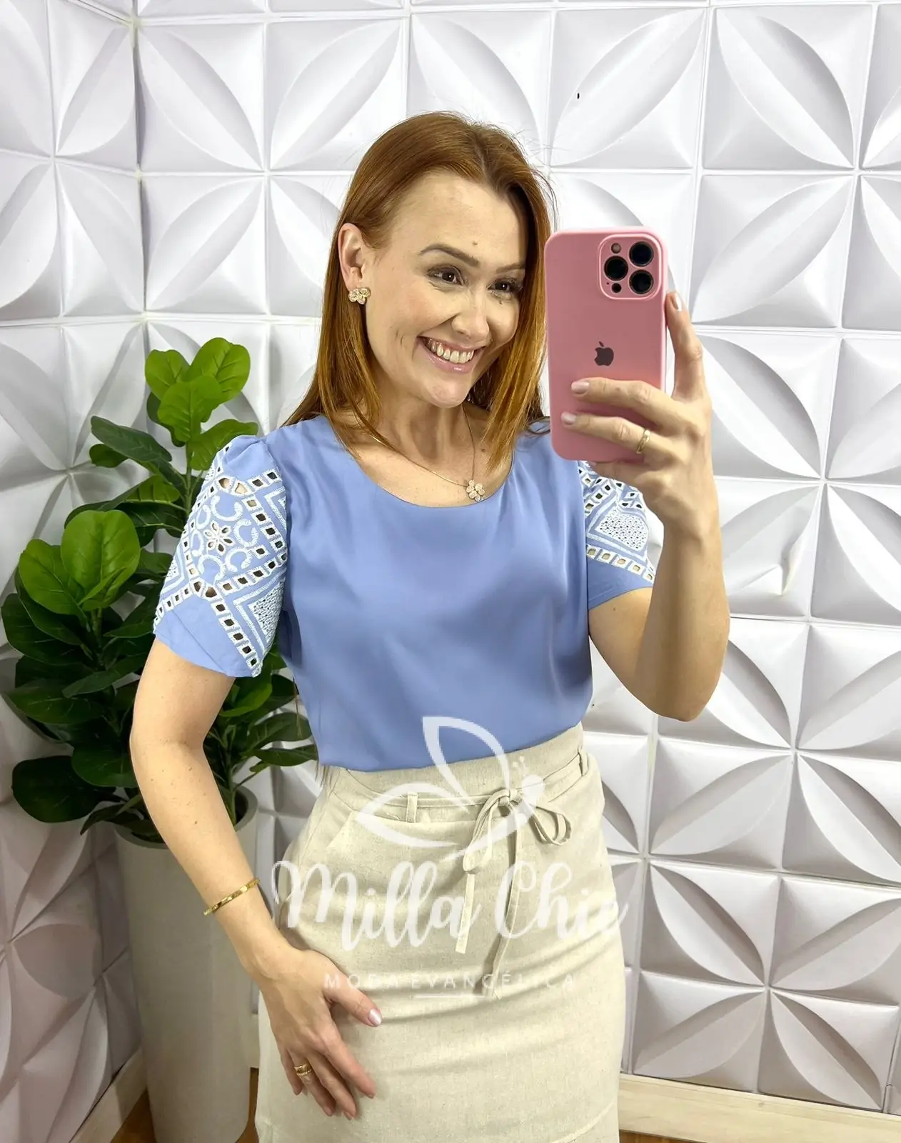 Blusa Cetim Manga Com Bordado Richelieu Sandra - Azul - Milla Chic