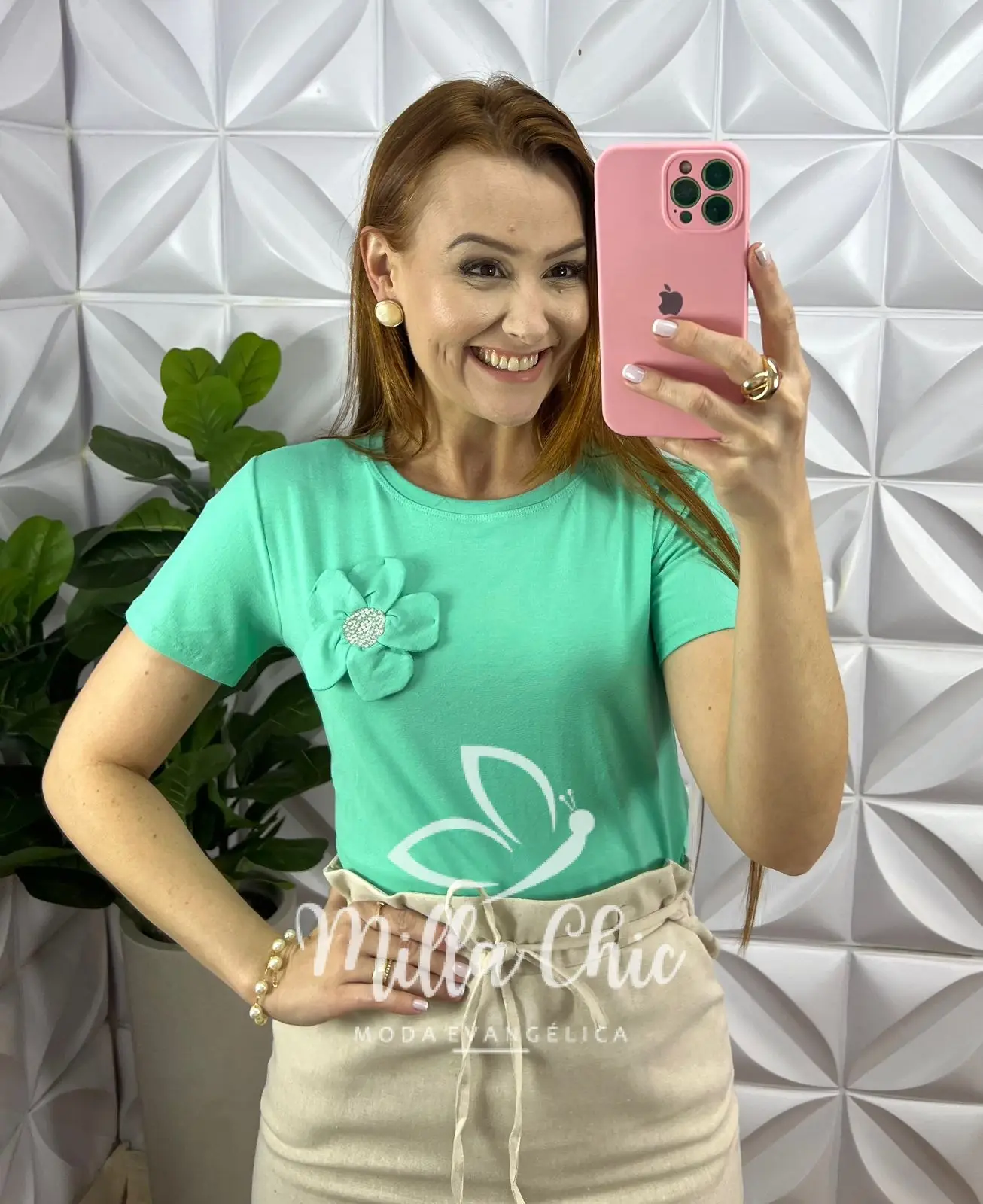 Blusa Com Aplicação de Flor No Viscolycra Florença - Verde Agua - Milla Chic