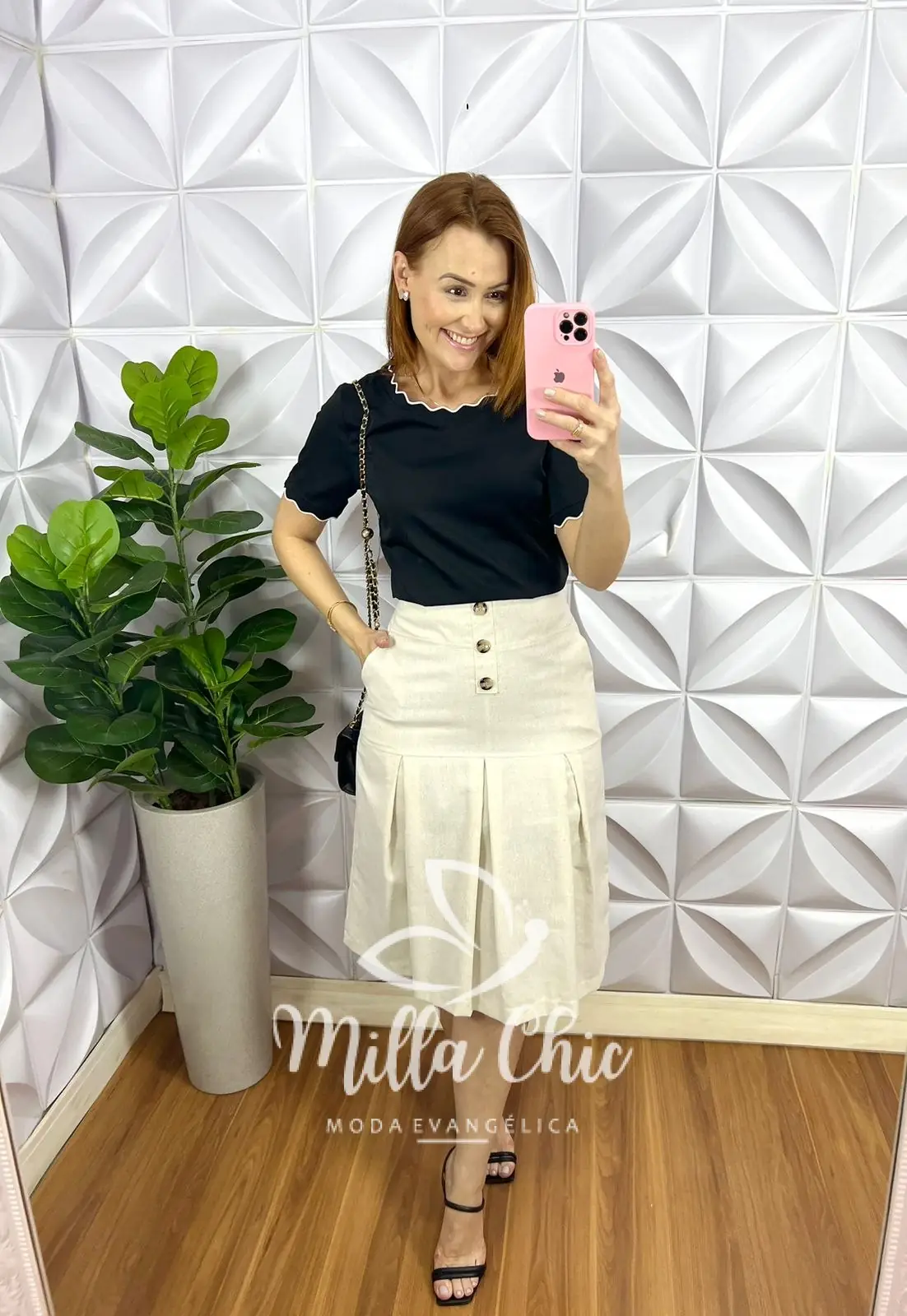 Saia Linho Com Pregas Com Bolso E Botão Ligia - Areia - Milla Chic