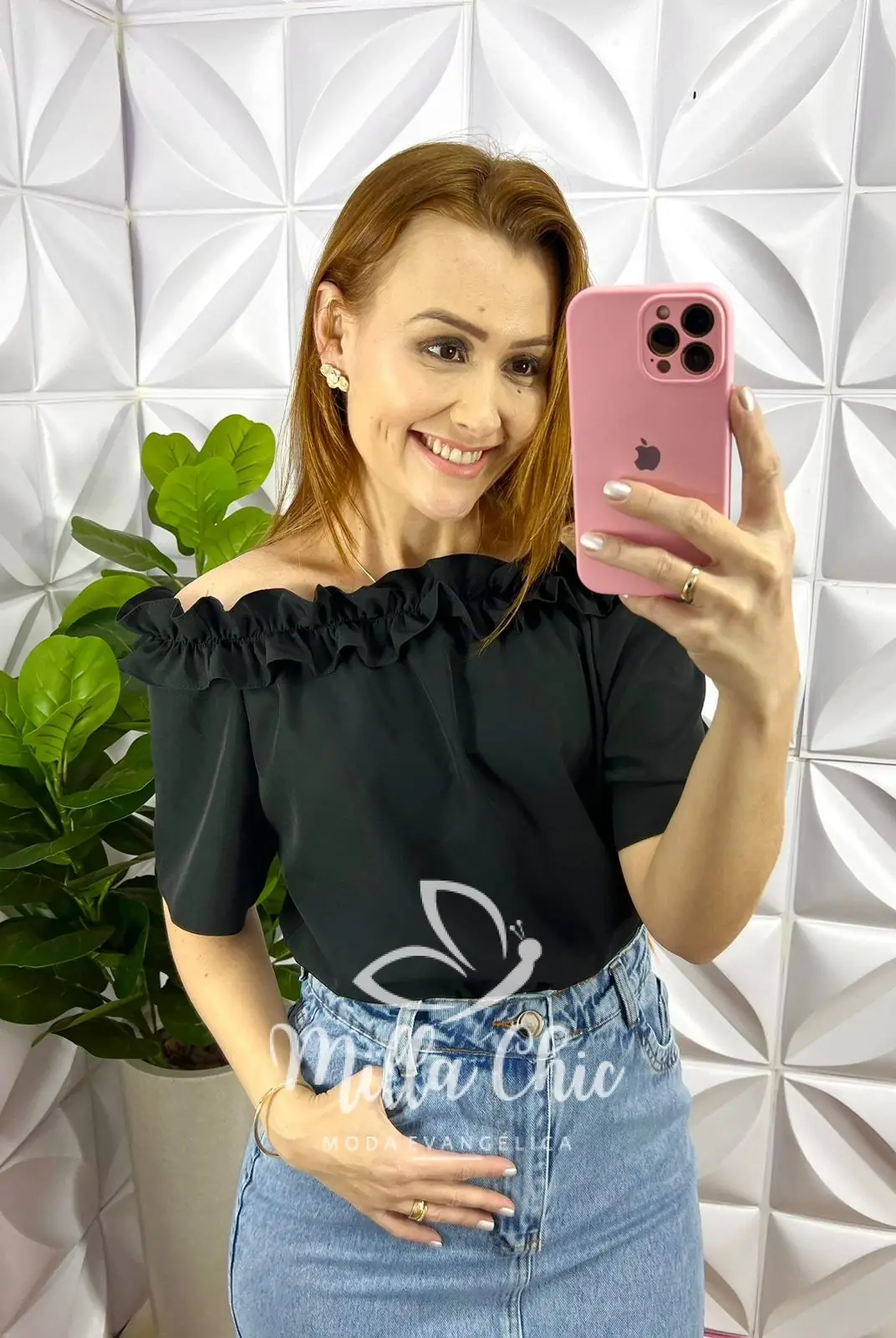 Blusa Crepinho Com Trabalhado de Flor Loren – Preta