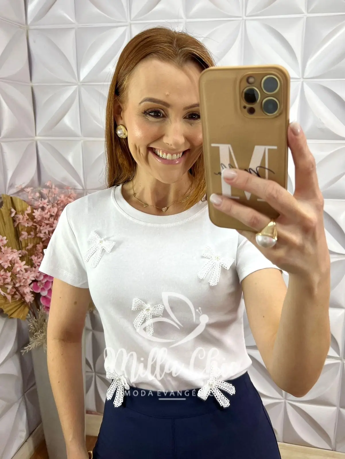 Aquela blusa confortável e estilosa para looks casuais ficarem mais elegantes e sofisticados. Confeccionada em malha 100% algodão. Muito confortável e fresca. E o detalhe que faz toda diferença e deixa ela linda e delicada e muito chic são as aplicações em laços de guipper . É o que traz toda a elegância para essa blusa.