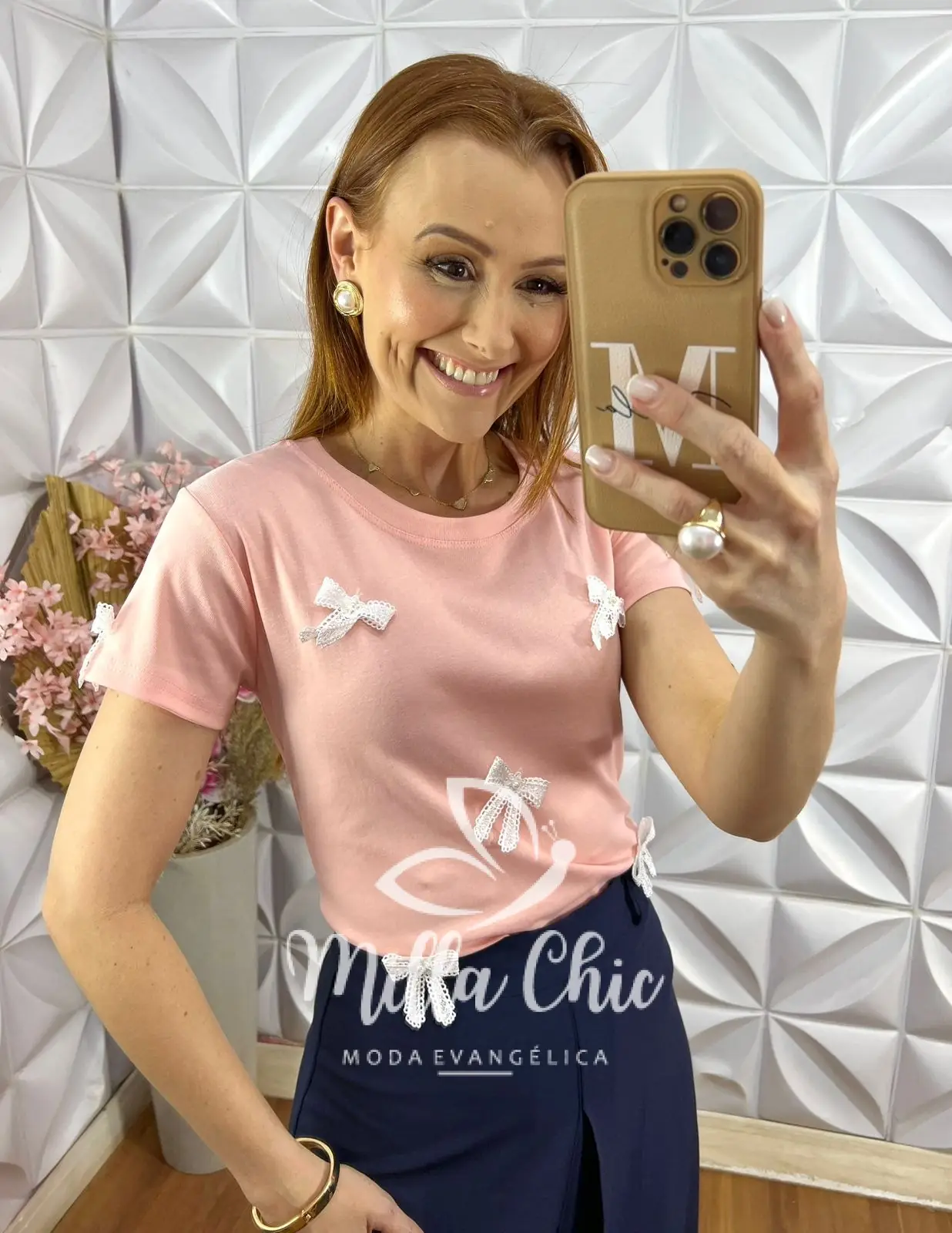 Aquela blusa confortável e estilosa para looks casuais ficarem mais elegantes e sofisticados. Confeccionada em malha 100% algodão. Muito confortável e fresca. E o detalhe que faz toda diferença e deixa ela linda e delicada e muito chic são as aplicações em laços de guipper . É o que traz toda a elegância para essa blusa.