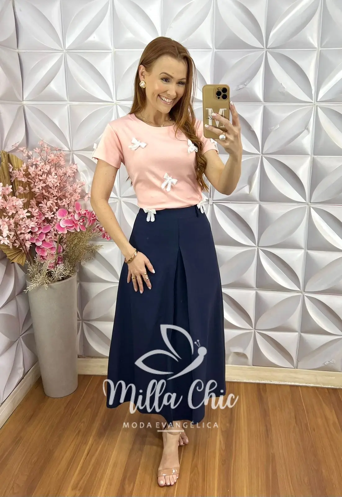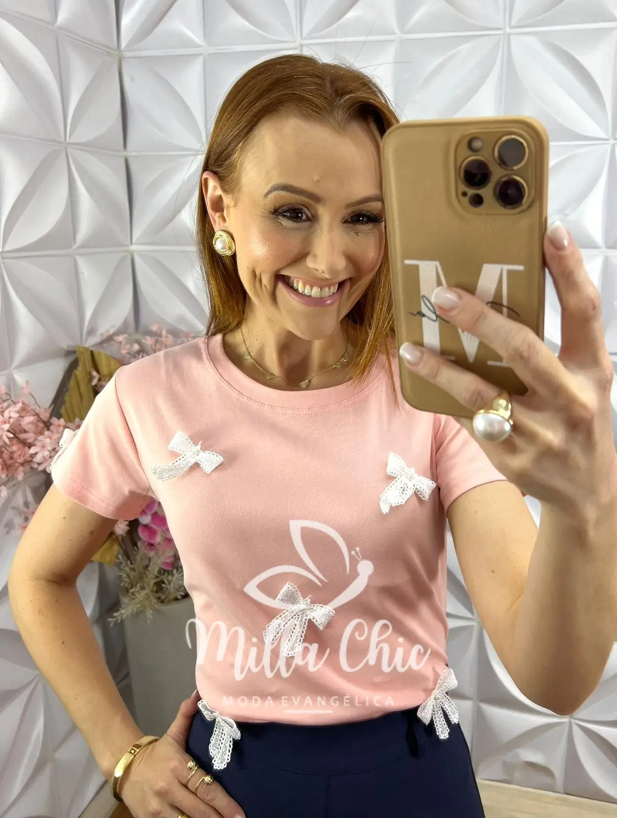 Blusa Gioconda em Malha Algodão com Lacinho – Rosa Claro