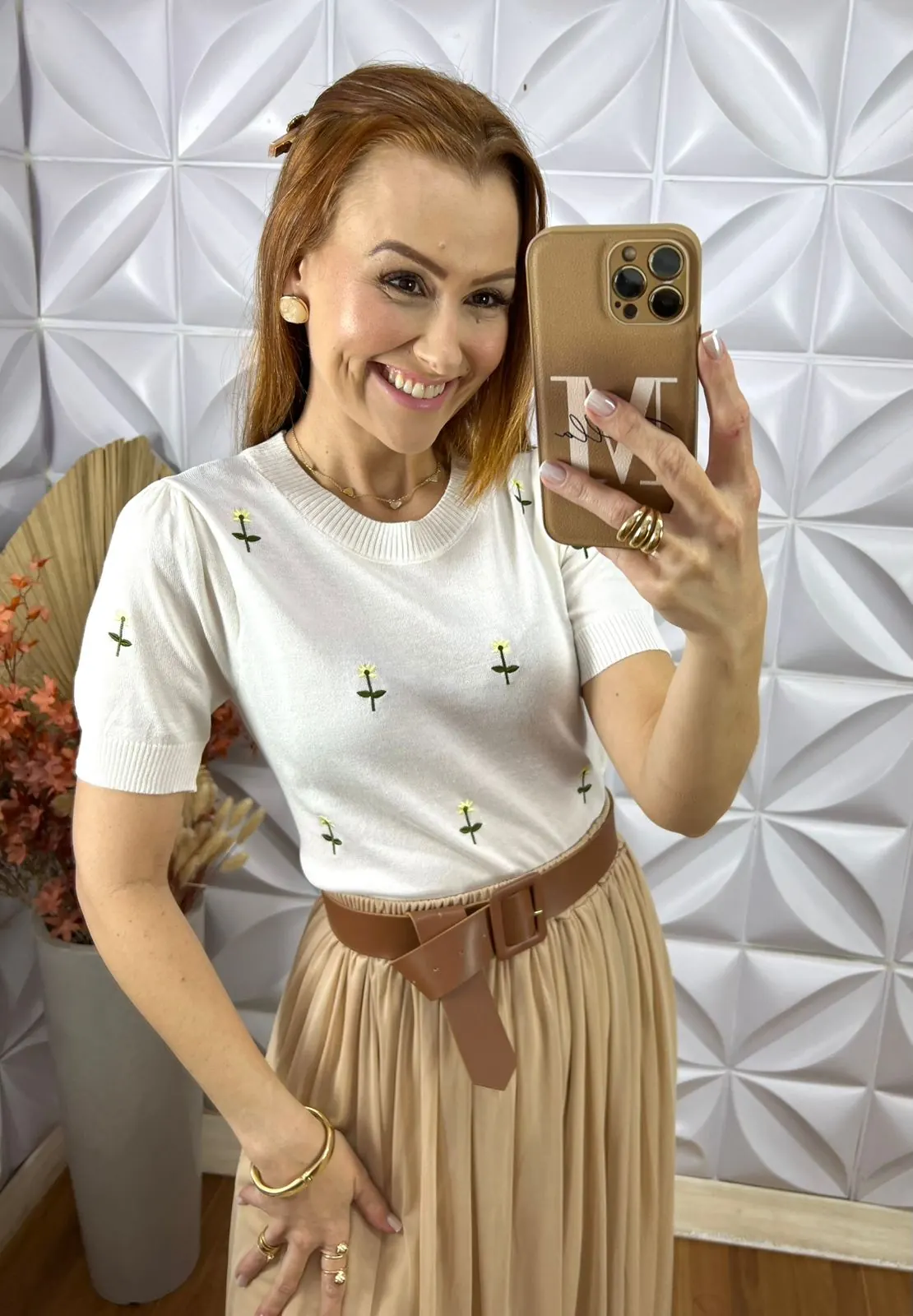 Blusa Gorete Em Tricot Modal Bordada- Branco - Milla Chic