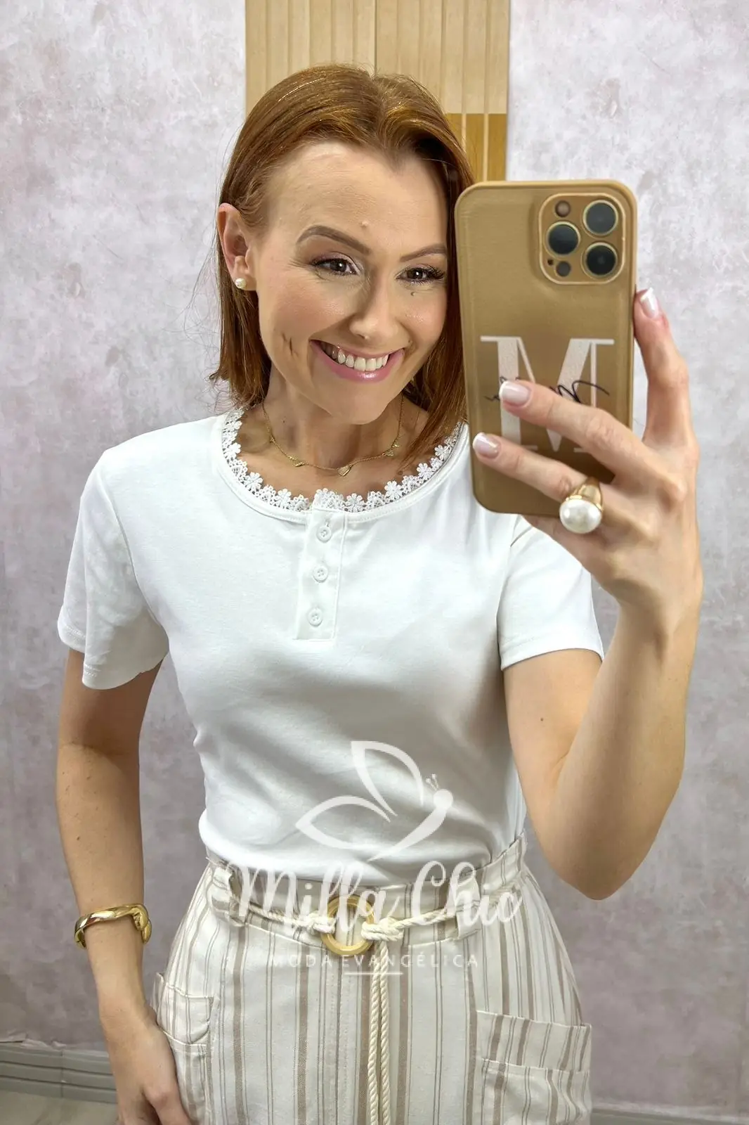 Aquela blusa confortável e estilosa para looks casuais ficarem mais elegantes e sofisticados. Confeccionada em malha 100% algodão. Muito confortável e fresca. E o detalhe que faz toda diferença e deixa ela linda, delicada e muito chic é o guipper em toda a volta do colarinho . Muito delicada e sofisticada . É o que traz toda a elegância para essa blusa e deixa maravilhosa quem está usando .os botões são funcionais .