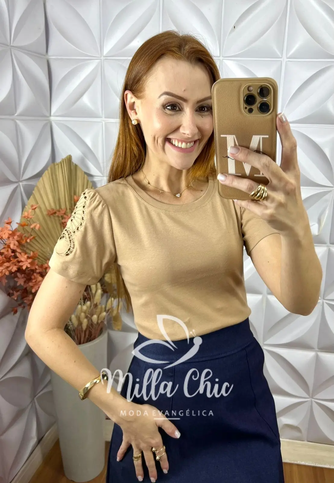 Aquela blusa confortável e estilosa para looks casuais ficarem mais elegantes e sofisticados . Confeccionada em malha 100% algodão . Muito confortável e fresca . E o detalhe que faz toda diferença é o bordado em Rechilieu nas mangas que dá todo o toque de sofisticado .