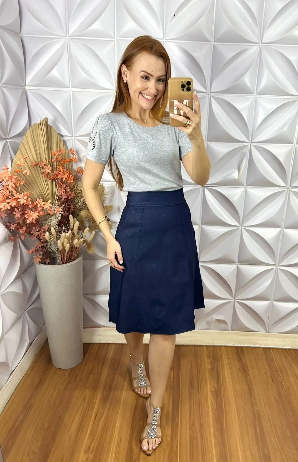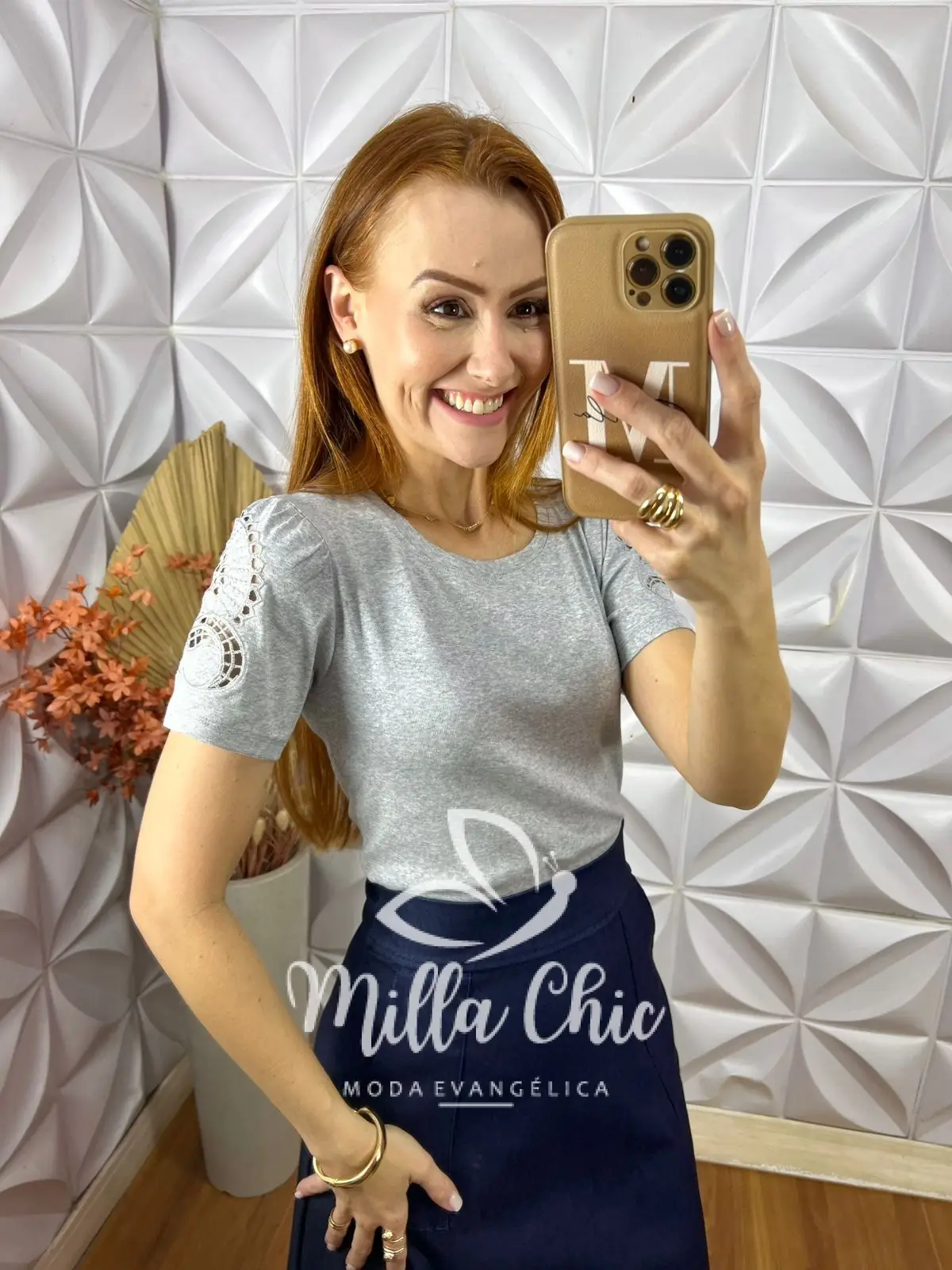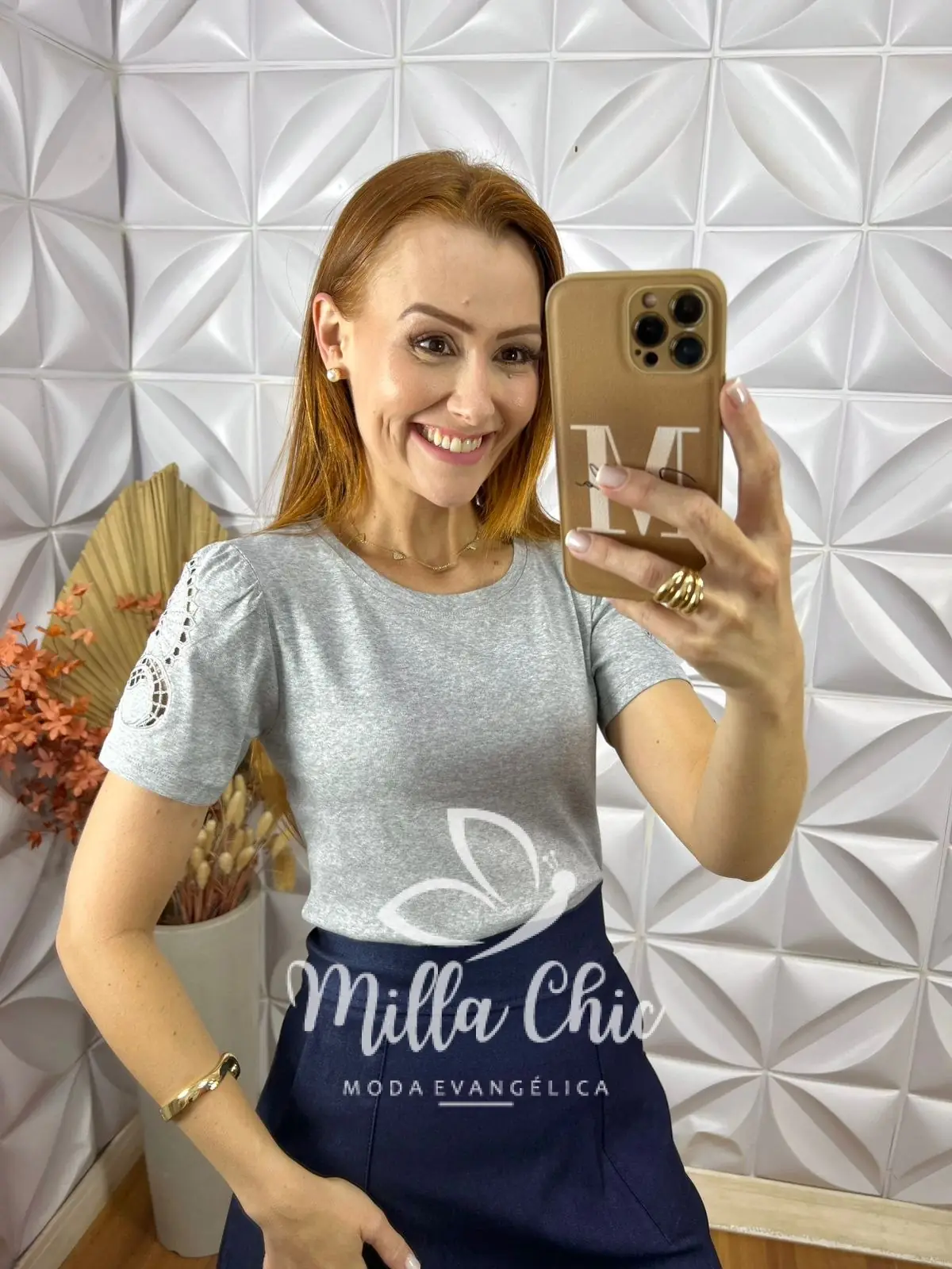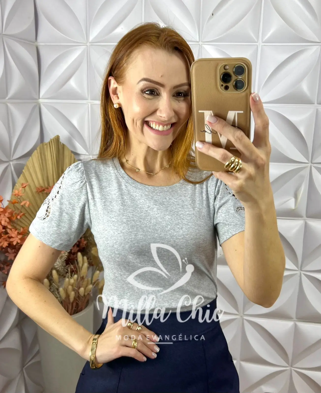 Aquela blusa confortável e estilosa para looks casuais ficarem mais elegantes e sofisticados . Confeccionada em malha 100% algodão . Muito confortável e fresca . E o detalhe que faz toda diferença é o bordado em Rechilieu nas mangas que dá todo o toque de sofisticado .