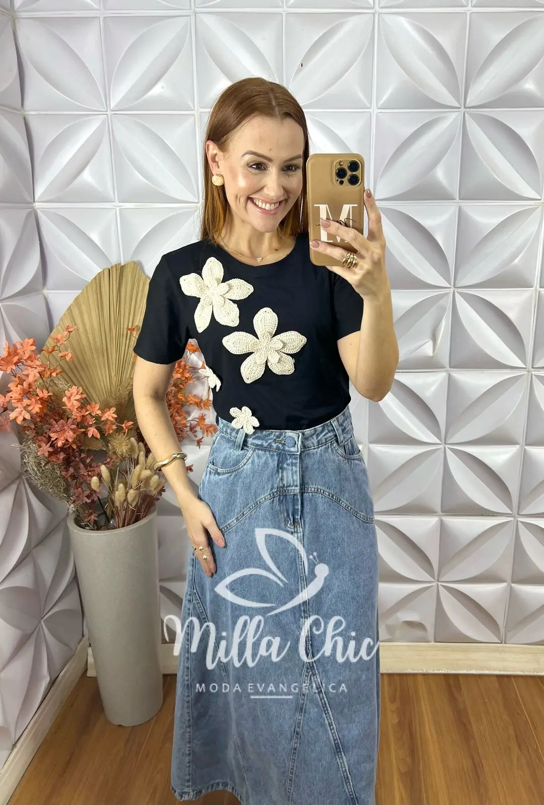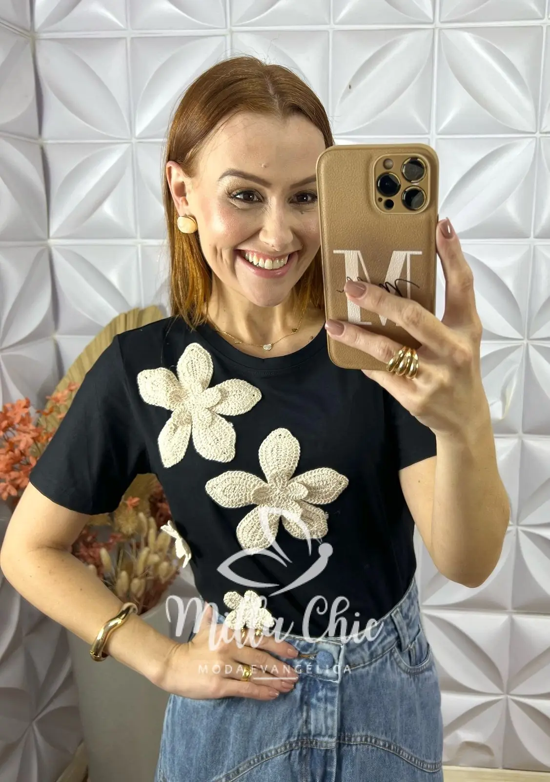 O detalhe que deixa ela maravilhosa é a aplicação das flores em crochê .