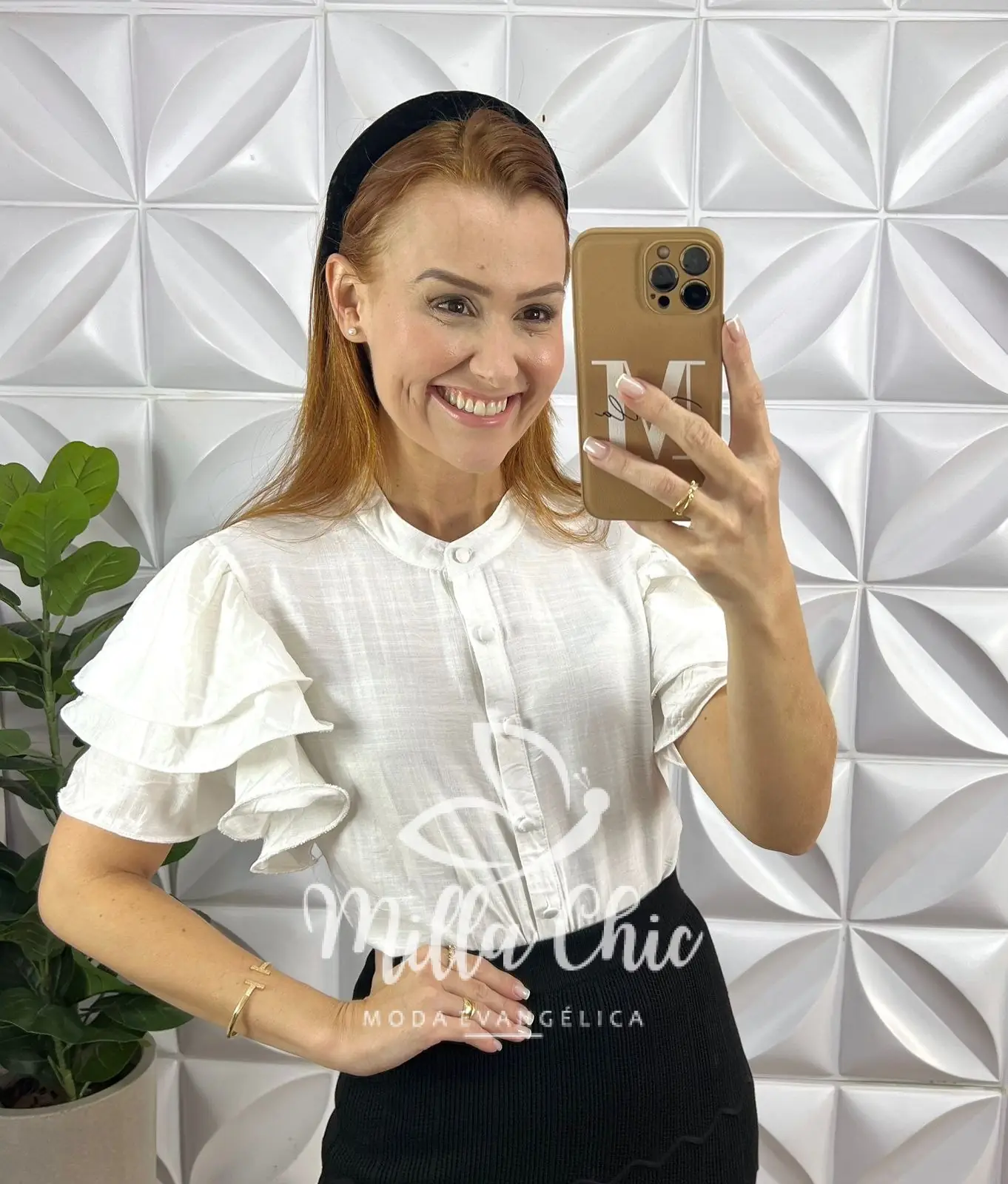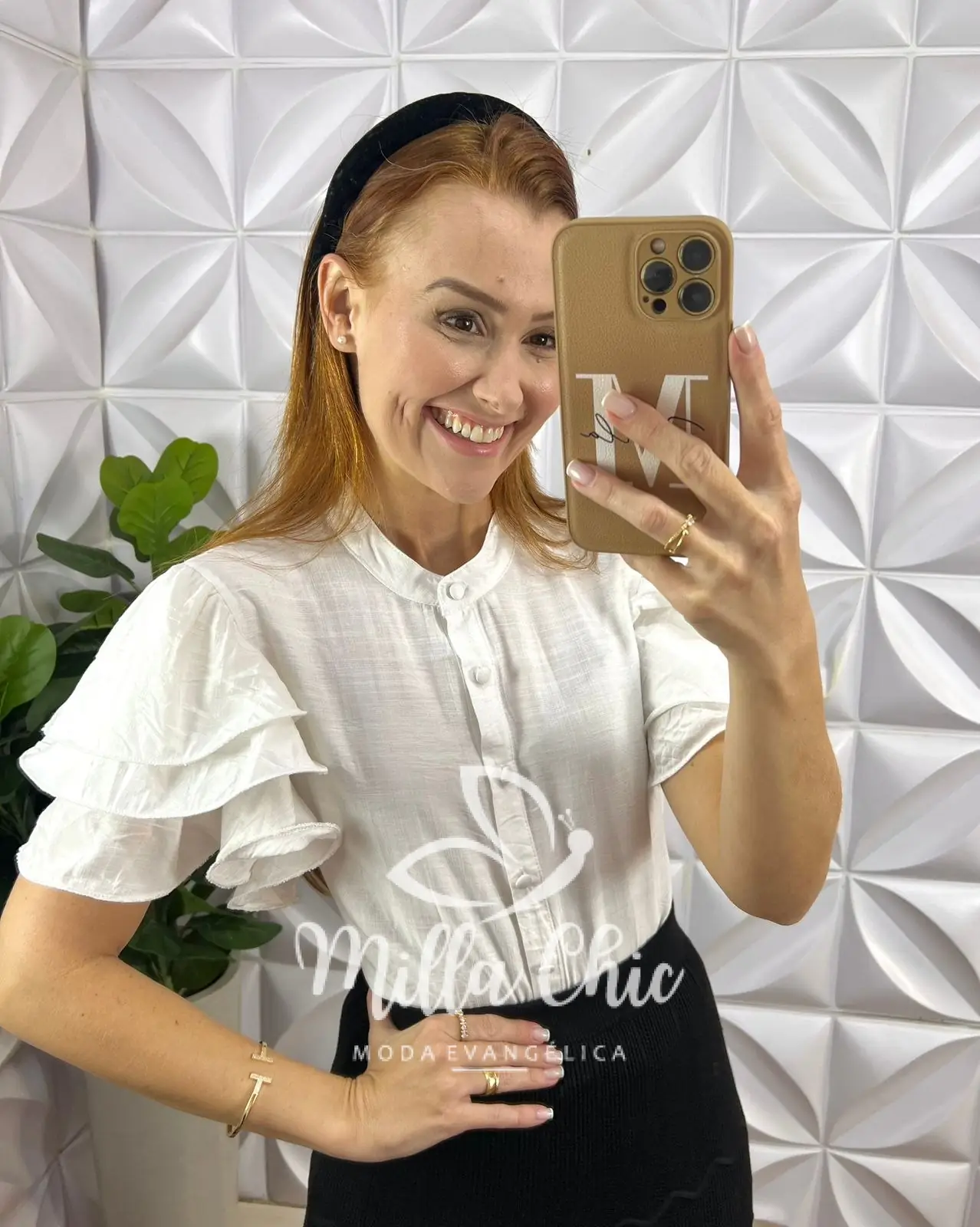 Nossa camisa Kali possui botões funcionais e encapados que deixa ela mais chic . Uma camisa clássica com a gola padre e com o toque moderno da manga em babados que tá um toque de elegância sem igual para ela .