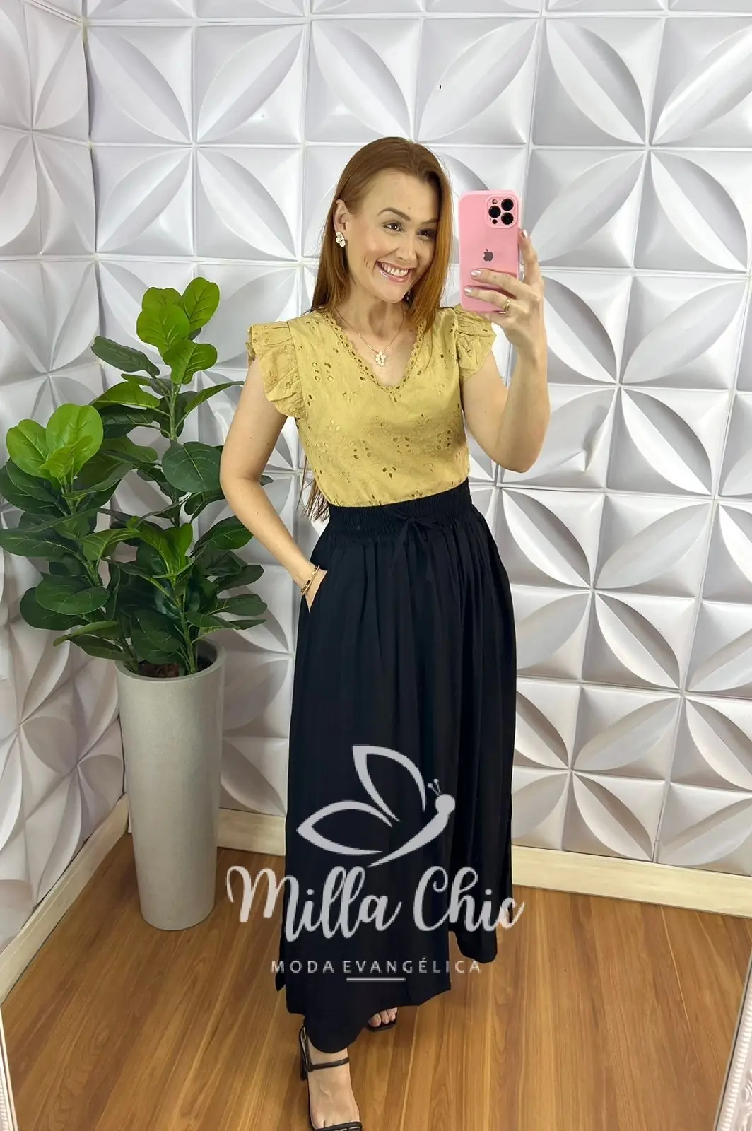 Saia Viscolinho Longa com Lastex na Cintura Adriana - Preto - Milla Chic