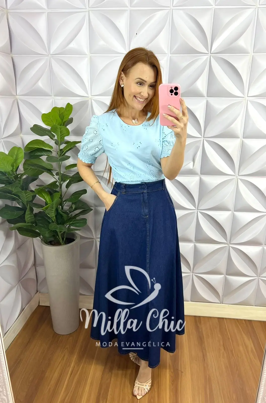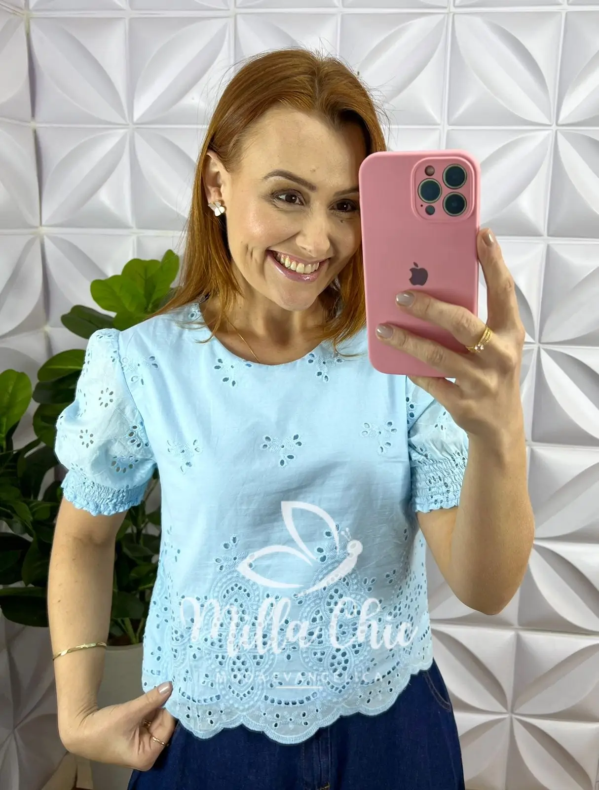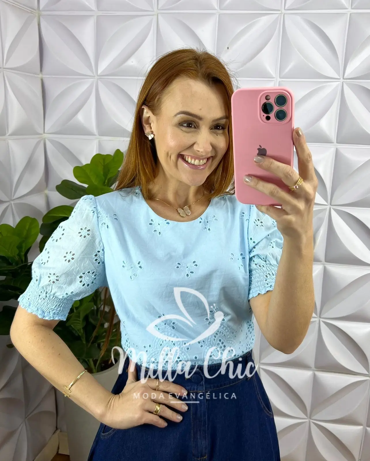 Blusa Laise Algodão Manga Princesa Amanda - Azul - Milla Chic