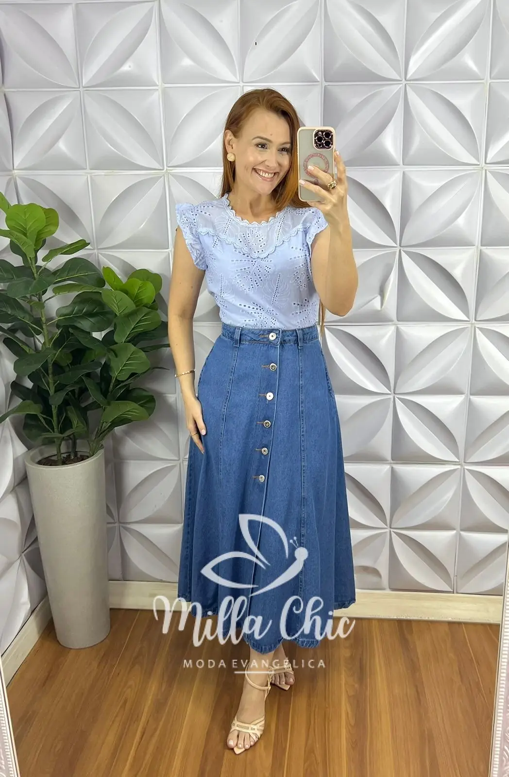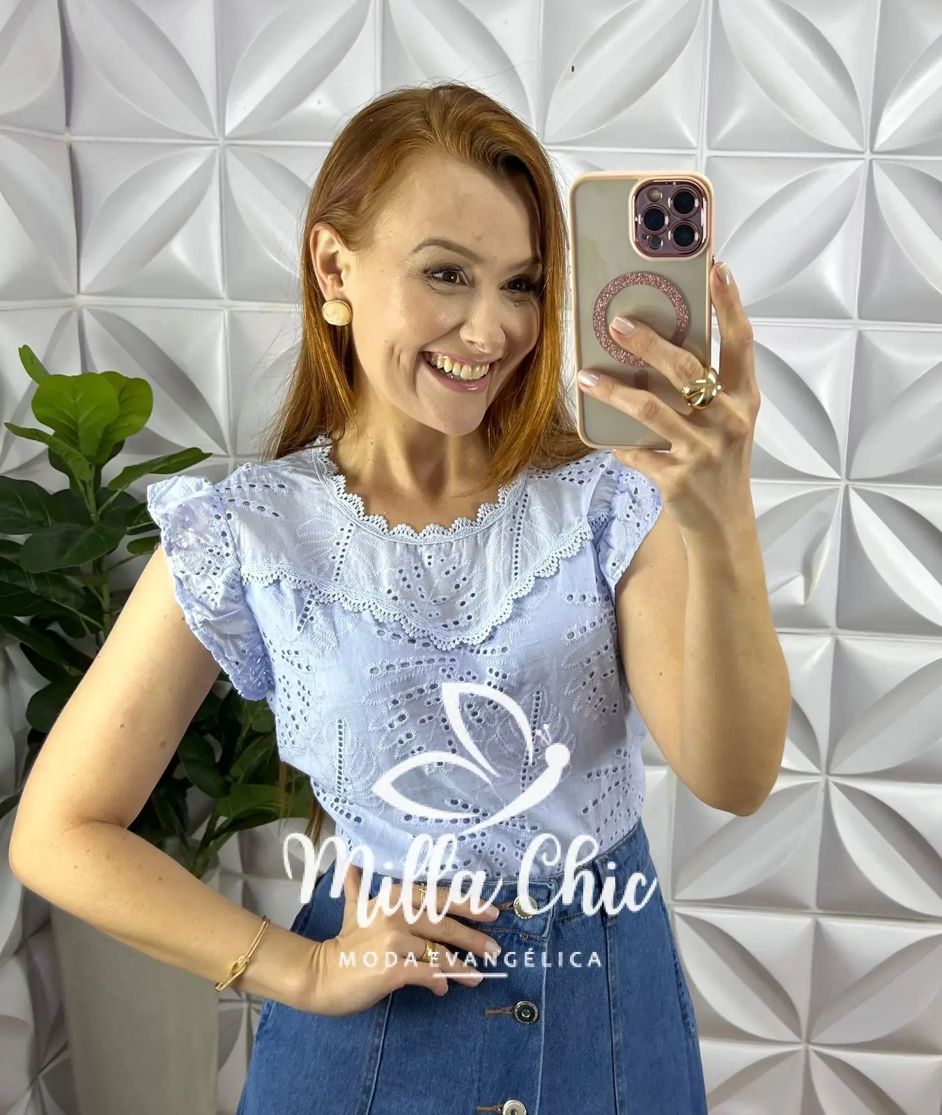 Blusa Laise de Algodão Bordado de Guipper Manga Babadinho Margarida – Azul