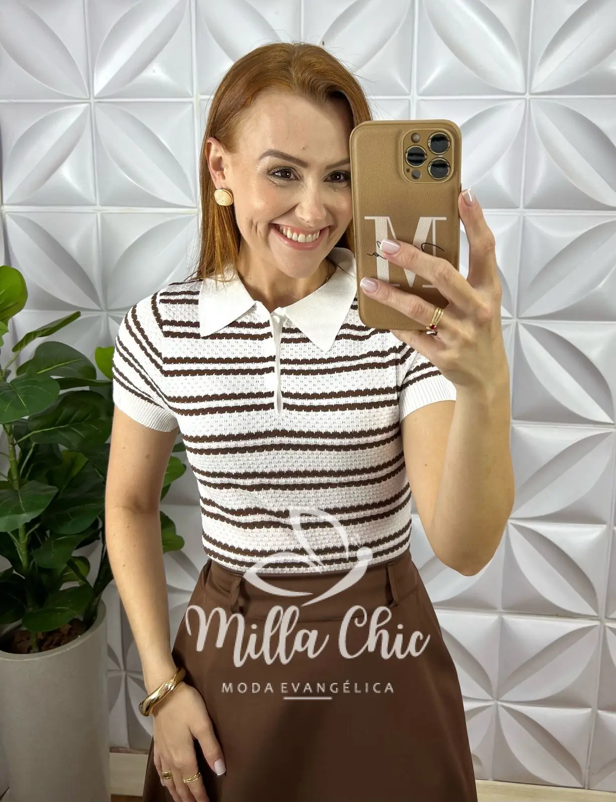 Blusa Lauren Tricot Modal - Marrom e Branca - Milla Chic