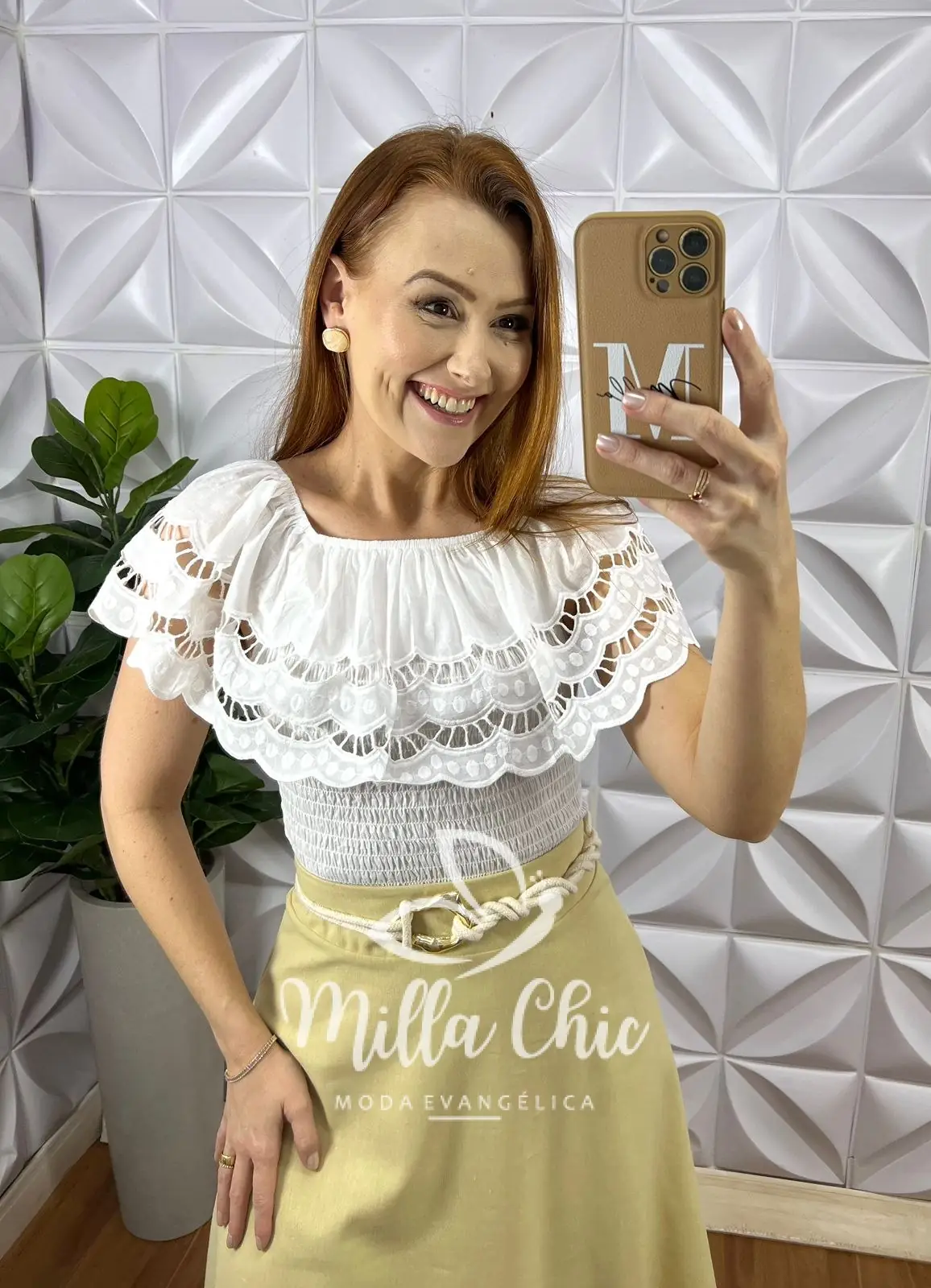 Blusa Lesie De Algodão Corpo de Lastex Babado No Decote Tereza – Branca
