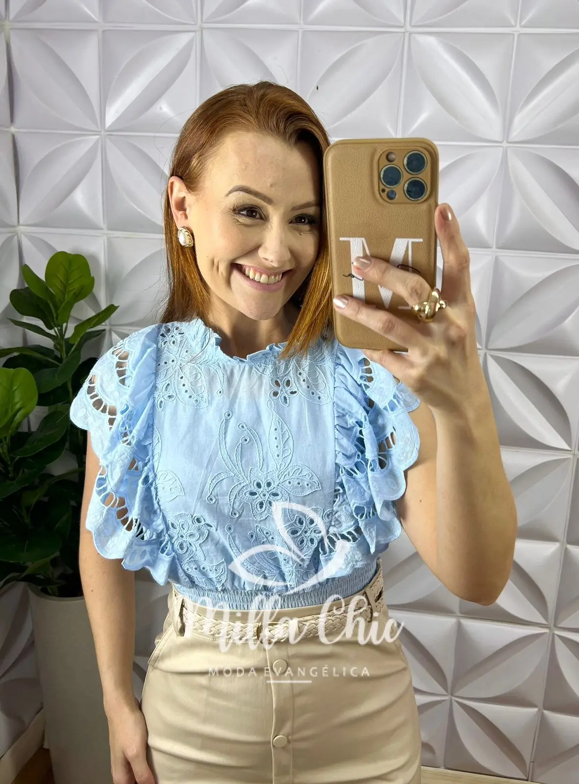 Blusa Lesie De Algodão Manga Babadinho Lastex Na Cintura Helena – Azul