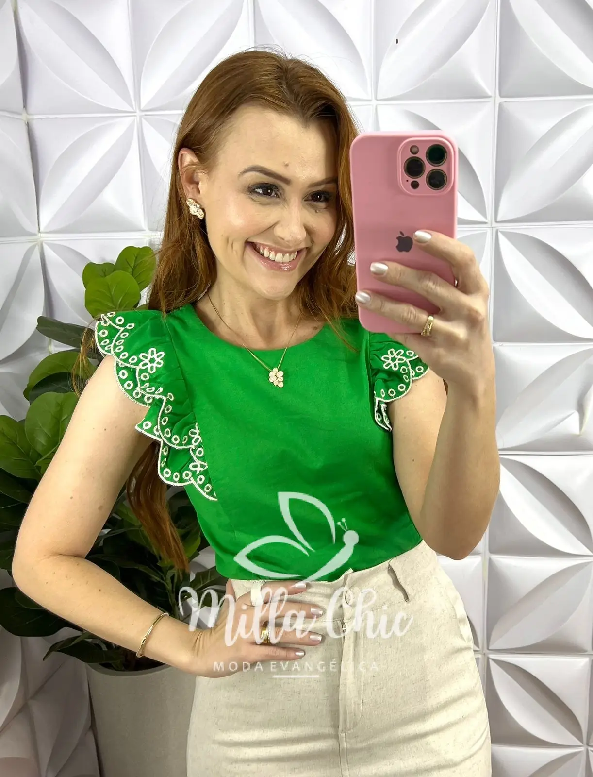 Blusa Linho Com Manga Babadinho Bordada Florença - Verde - Milla Chic