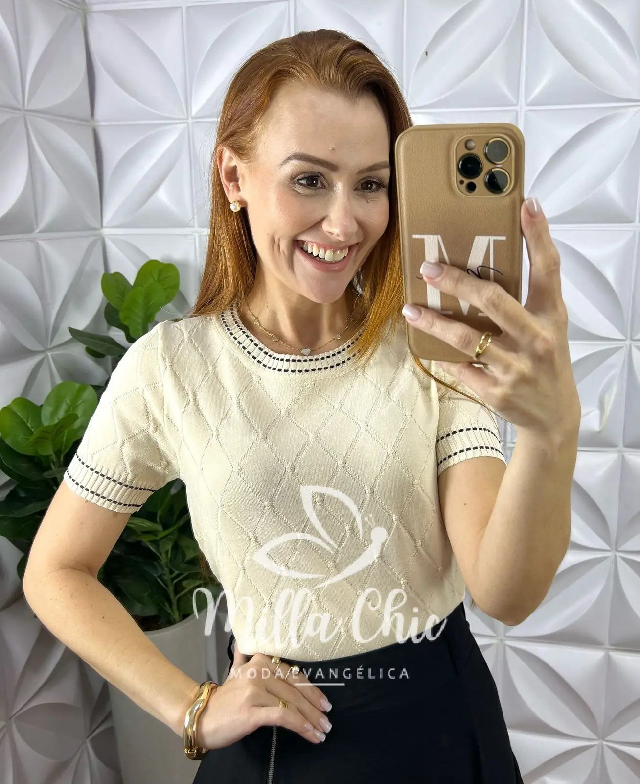 Ela deixa o look mais chic. E esse modelo tem o tricot todo trabalhado. E os prespontos na gola e na manga deixando ela muito charmosa.