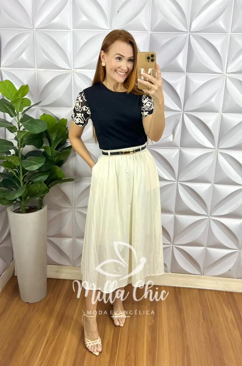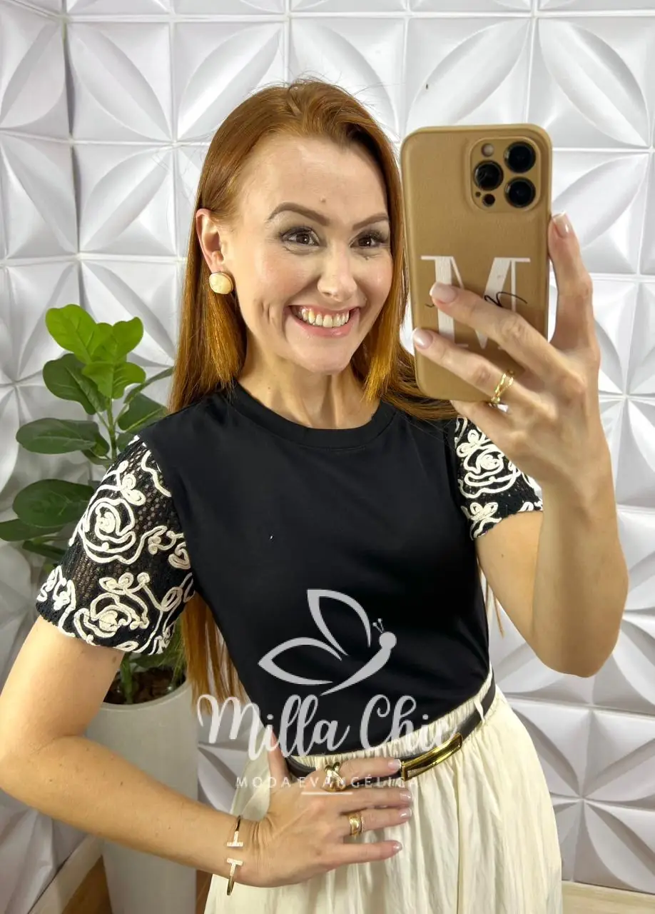 Blusa Maiami Malha Algodão Bordado Crochê - Preto - Milla Chic