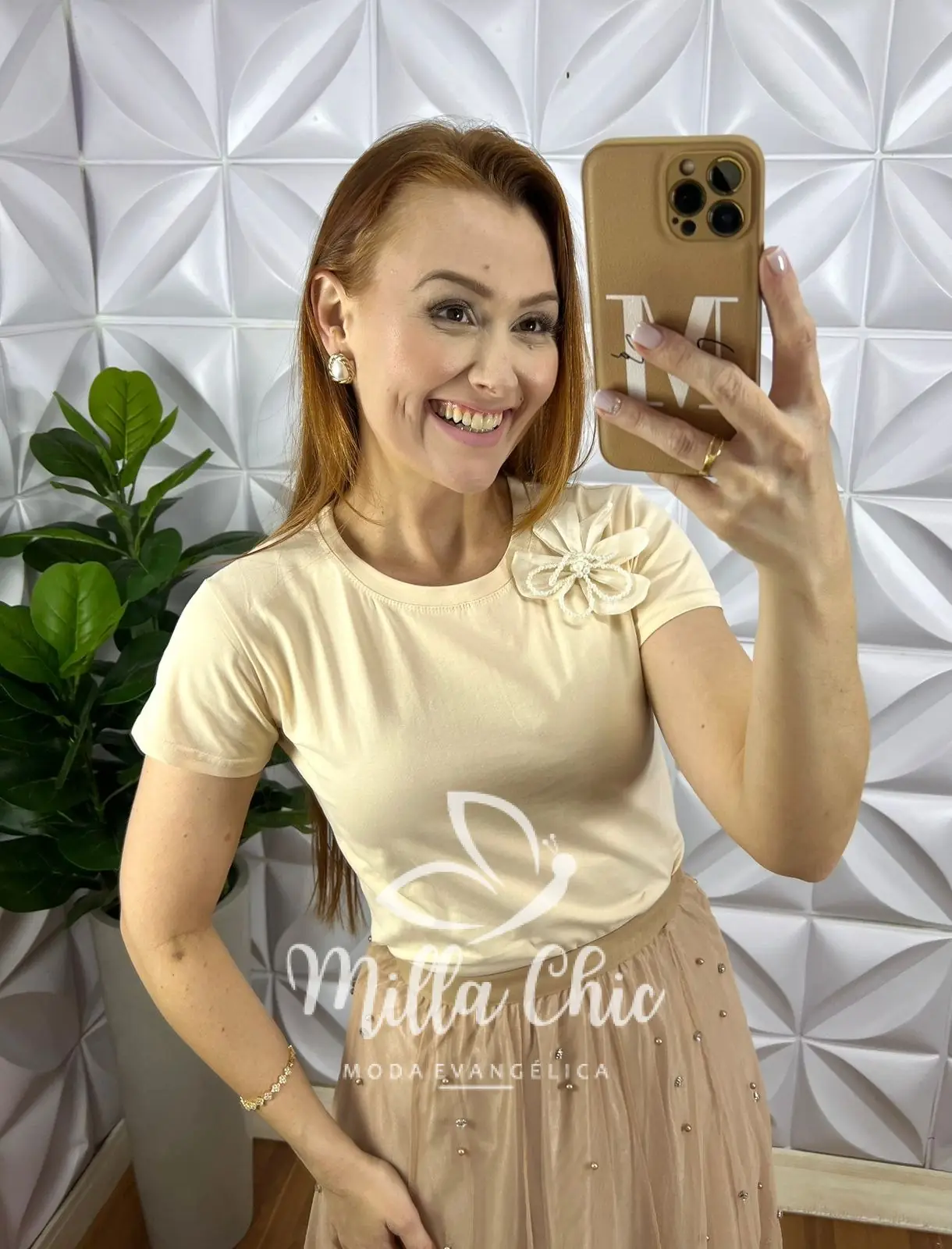 Blusa Malha De Algodão Com Aplicação de Flor Com Tule e Perola Giovane – Manteiga