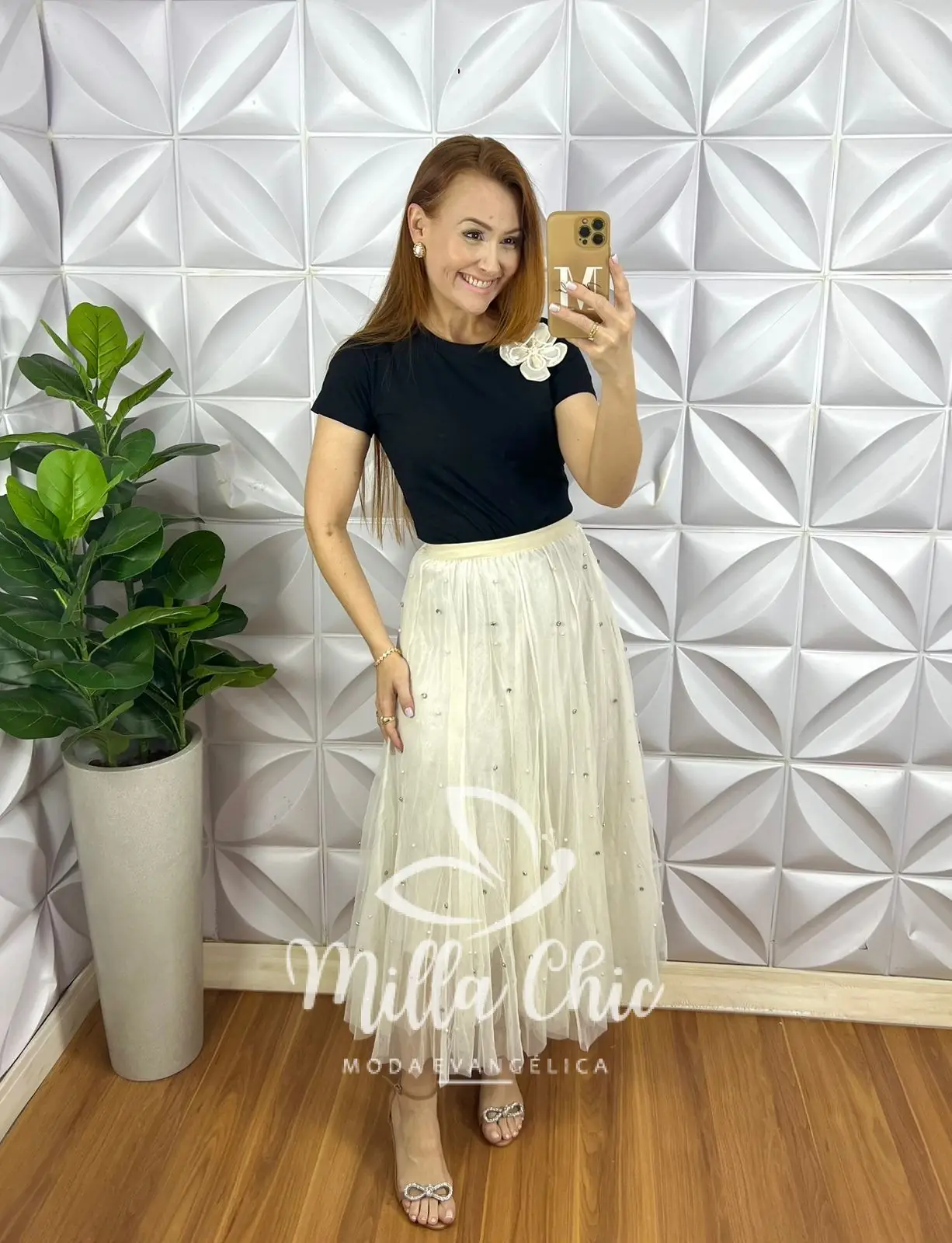 Possui: Manga justa, Gola redonda marcada, aplicação de flor com tule e perola, comprimento ideal.
