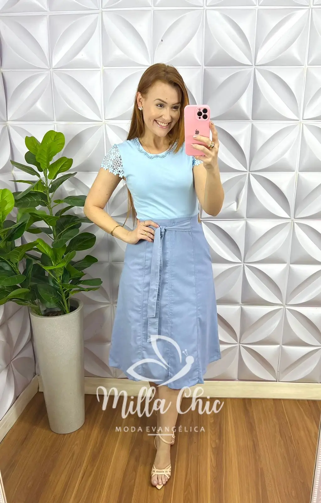 Blusa Malha De Algodão Manga De Guipper Bordado De Perola Paula - Baby Blue - Milla Chic