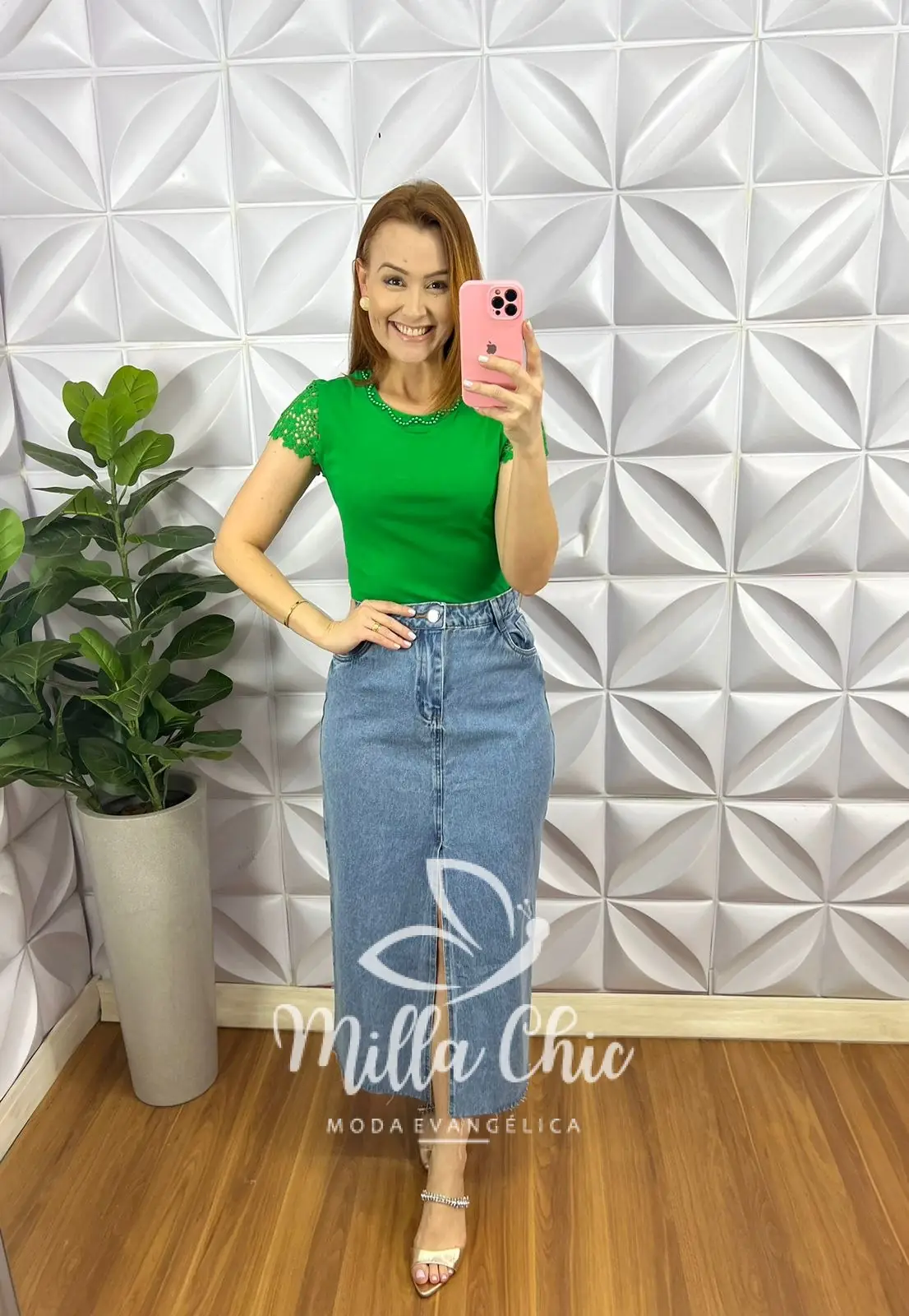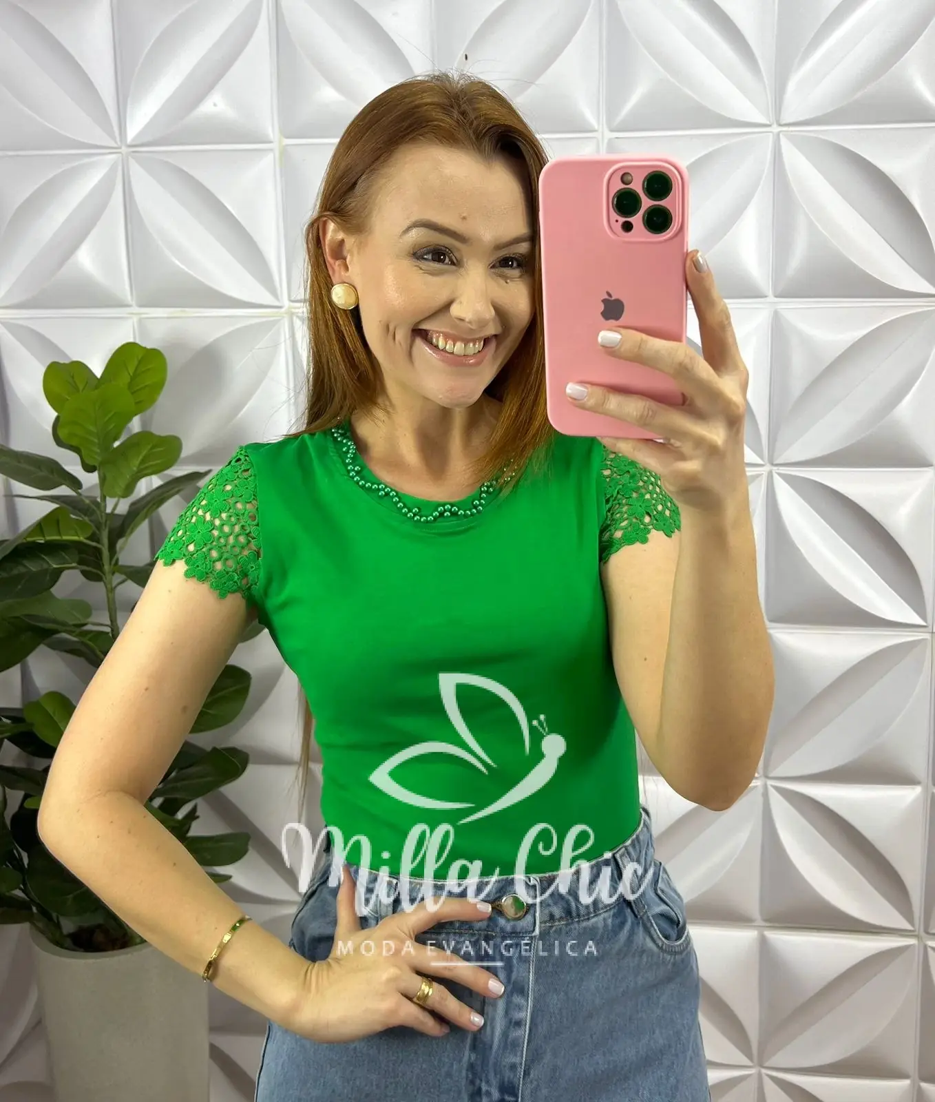 Blusa Malha De Algodão Manga De Guipper Bordado De Perola Paula – Verde