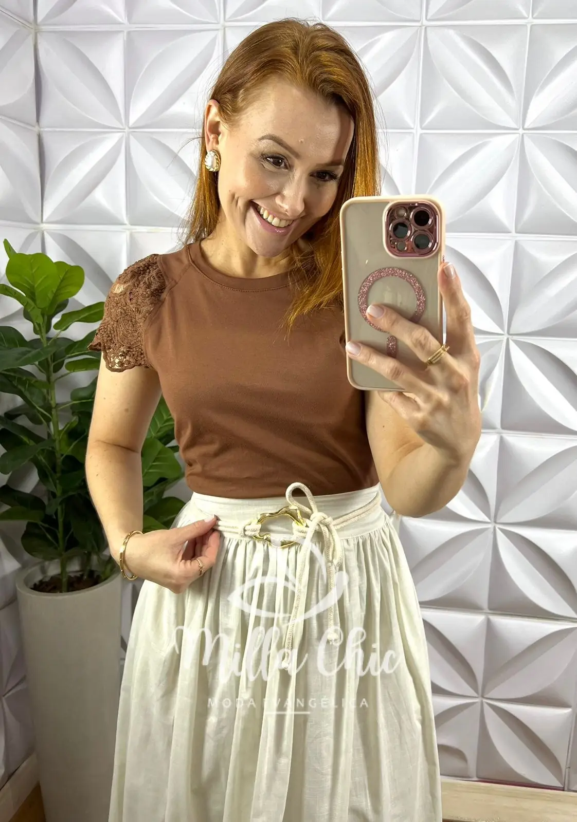 Blusa Malha De Algodão Manga De Guipper Giovane - Marrom - Milla Chic