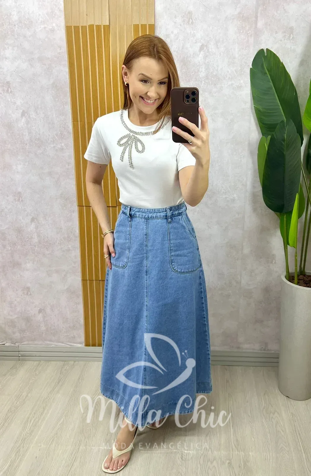 Aquela blusa confortável e estilosa para looks casuais ficarem mais elegantes e sofisticados. Confeccionada em malha 100% algodão. Muito confortável e fresca. E o detalhe que faz toda diferença e deixa ela linda, delicada e muito chic é o bordado em laço em strass e esfera. Todo bordado feito a mão . Esse bordado é o que traz toda a elegância para quem veste .