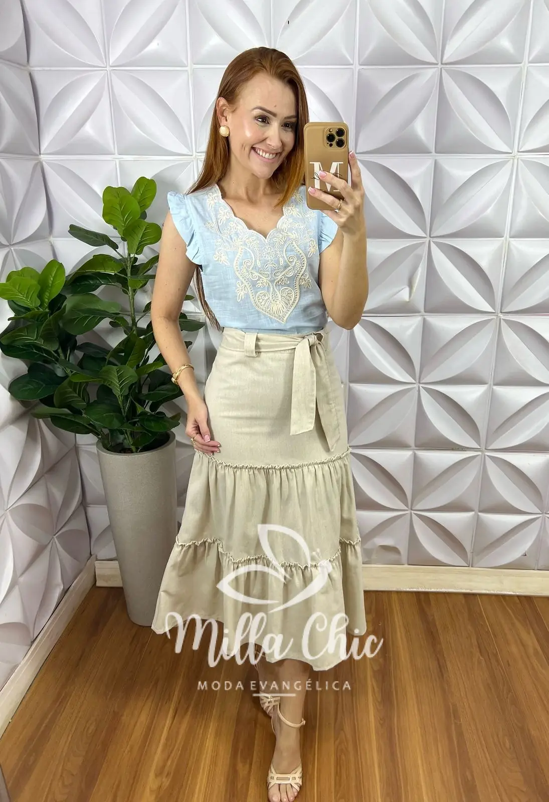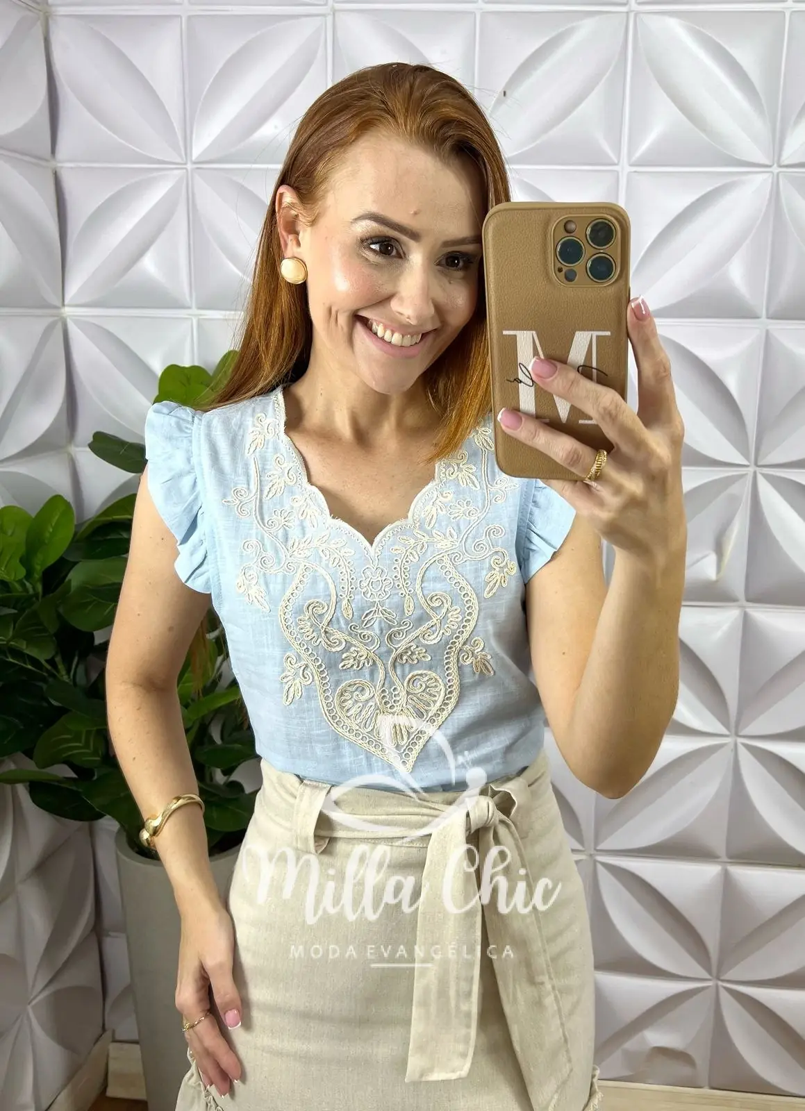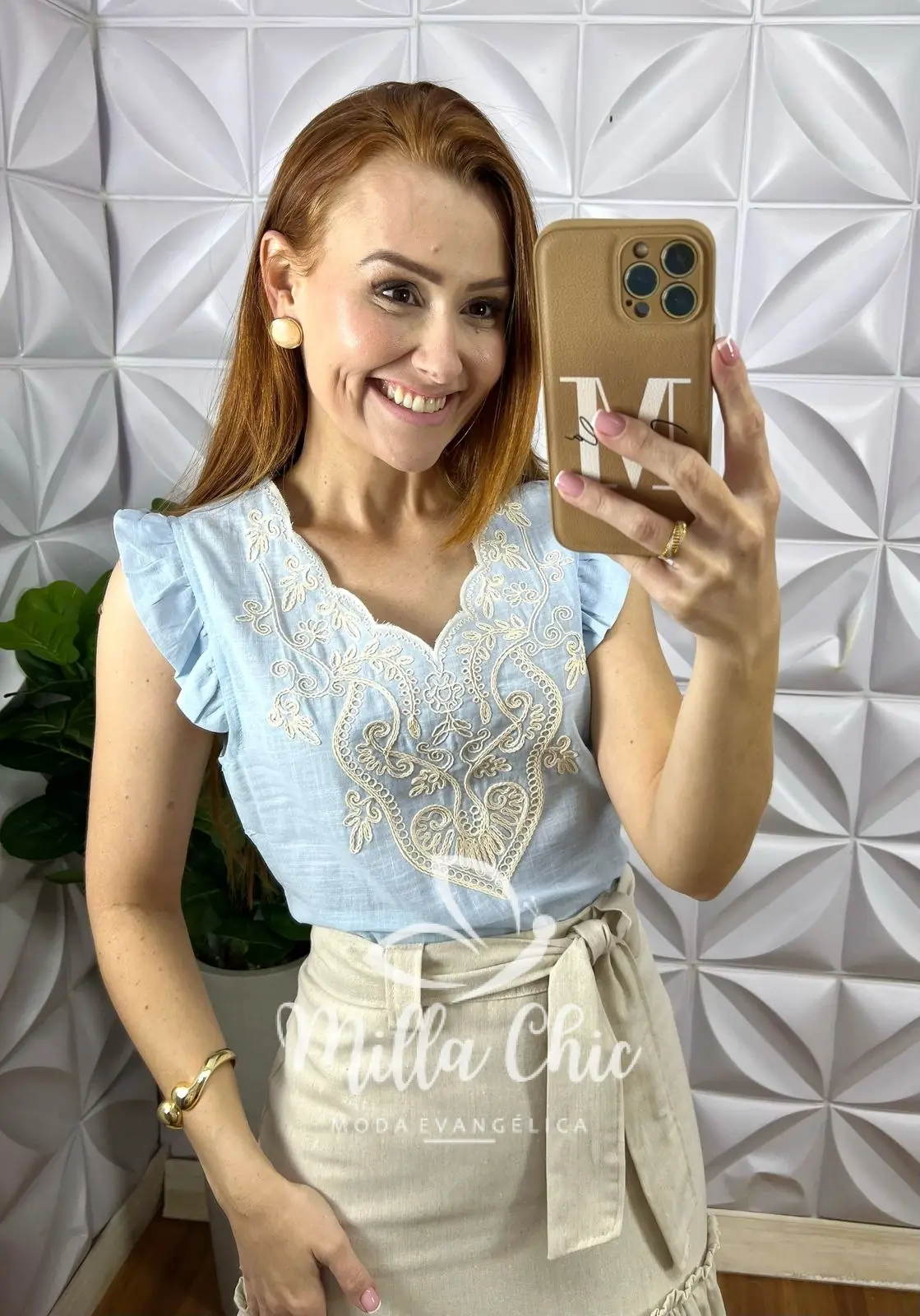 E o que deixa ela ainda mais linda e chic são os bordados na frente em cordone . As mangas são em babados o que deixa ela mais fresca e moderna .