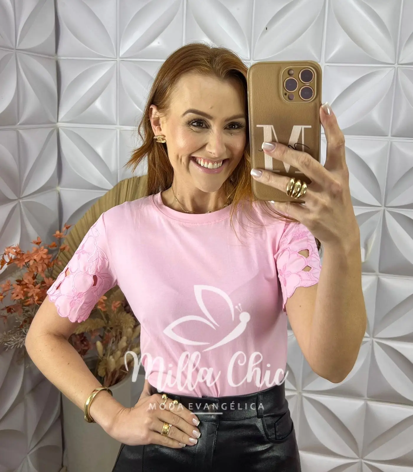 Aquela blusa confortável e estilosa para looks casuais ficarem mais elegantes e sofisticados . Confeccionada em malha 100% algodão . Muito confortável e fresca . E o detalhe que faz toda diferença é o bordado em Rechilieu nas mangas que dá todo o toque de sofisticado .