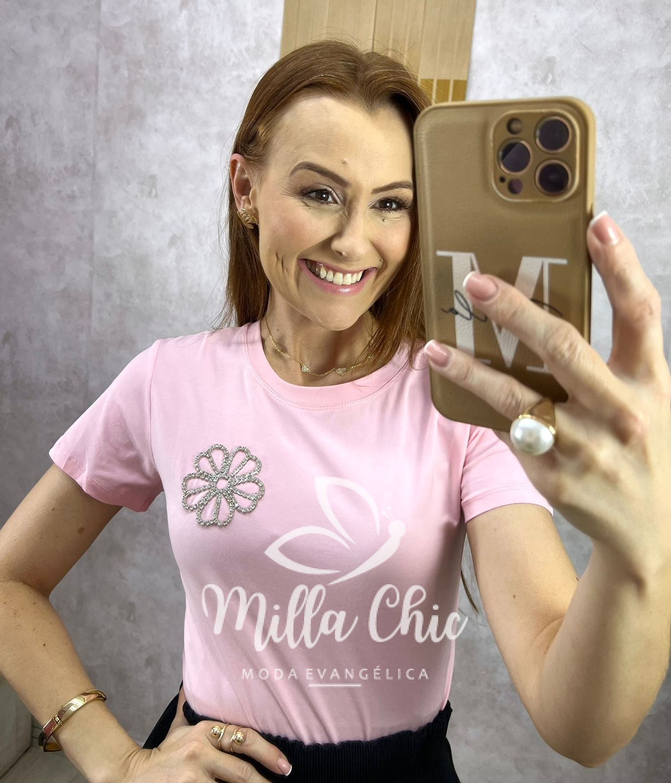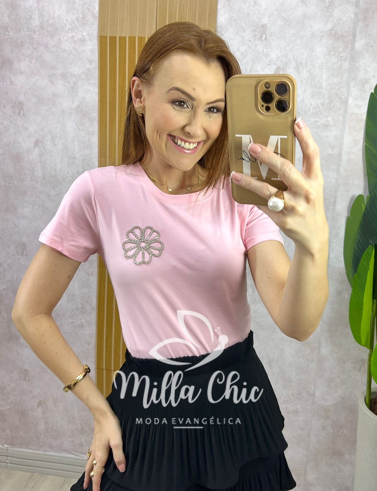 Aquela blusa confortável e estilosa para looks casuais ficarem mais elegantes e sofisticados. Confeccionada em malha 100% algodão. Muito confortável e fresca. E o detalhe que faz toda diferença e deixa ela linda, delicada e muito chic é a aplicação em strass . É o que traz toda a elegância para essa blusa.