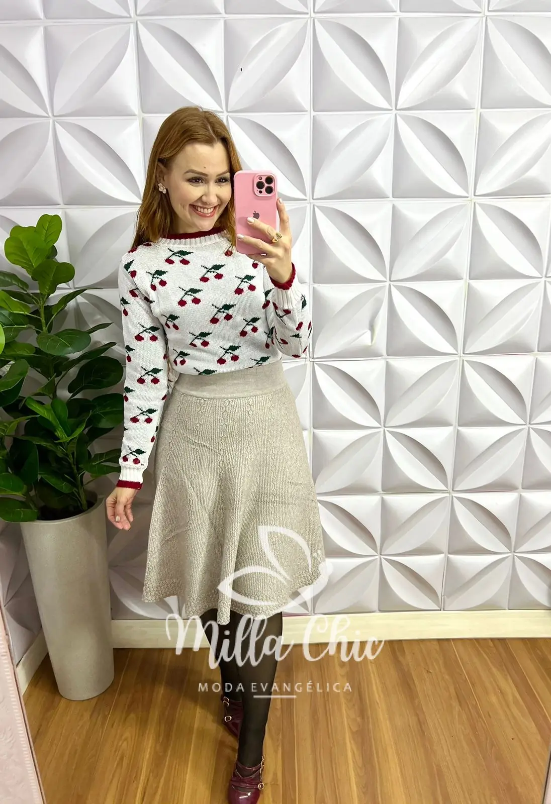 Blusa Estilo suéter no tricot que está uma delicadeza! Toda estampada de cerejinhas que esta um charme!