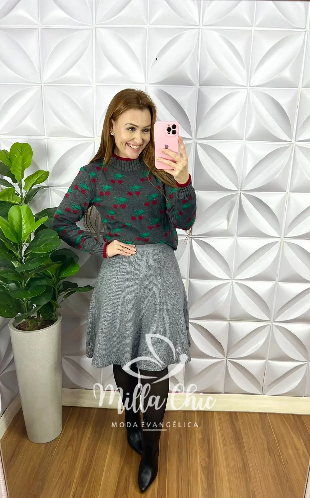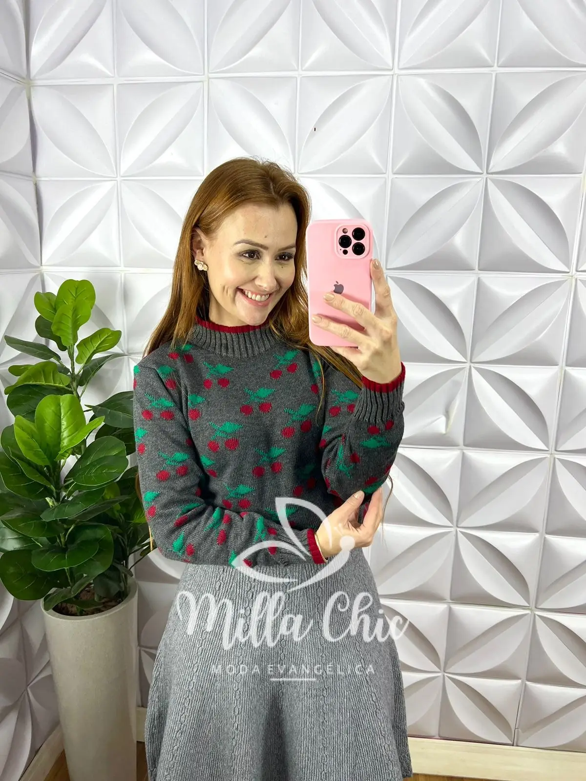 Blusa Suéter Tricot Estampada de Cereja Sofie – Cinza