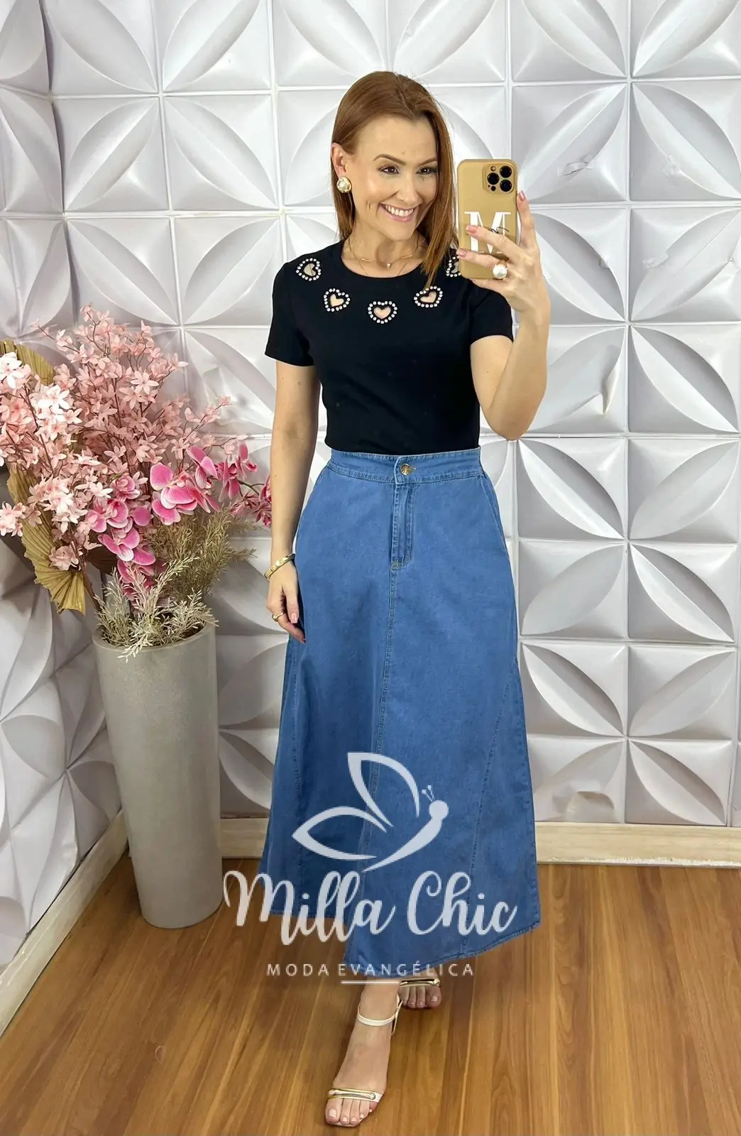 Blusa Suíça em Algodão com Aplicação - Preta - Milla Chic